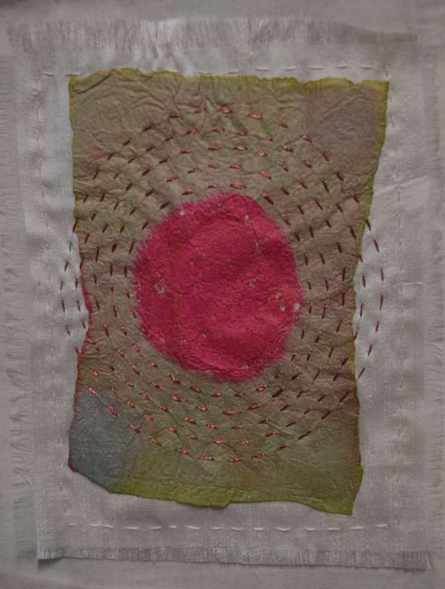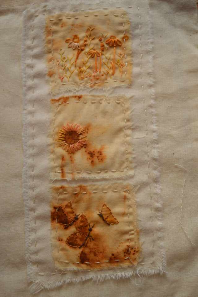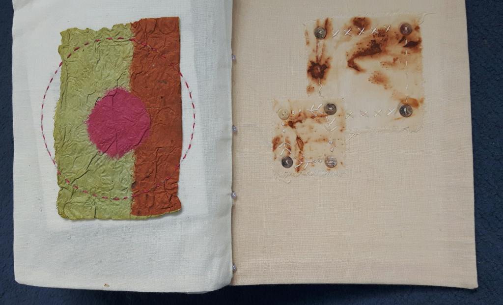 On the inside I used two samples from the rust-dying experiment,the buttons are little mother of pearl ones stitched upside down. The back page has a joomchi sample with just a circle of running stitch.
