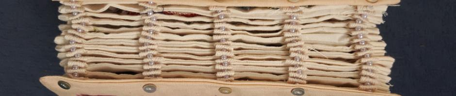 With everything stitched I just had to put it together. The idea behind the tabs is that a spacer is used inbetween each one such as a bead or a pretty felt ball. I had some fairly small wooden beads which I had earmarked for the job but when I tried them it would have been two bulky – bearing in mind that I have a thrirteen pages plus the covers, even taking into account the bulkiness of some samples. I started rummaging through my bead box and found some small very pale mauve beads, they work perfectly. I used some beading thread and a very long needle which Helen had provided in a kit I bought previously. On the front and back I decided to use little mother of pearl buttons to start and end each row of beads. I love the effect of the beads as you’re leafing through the book.