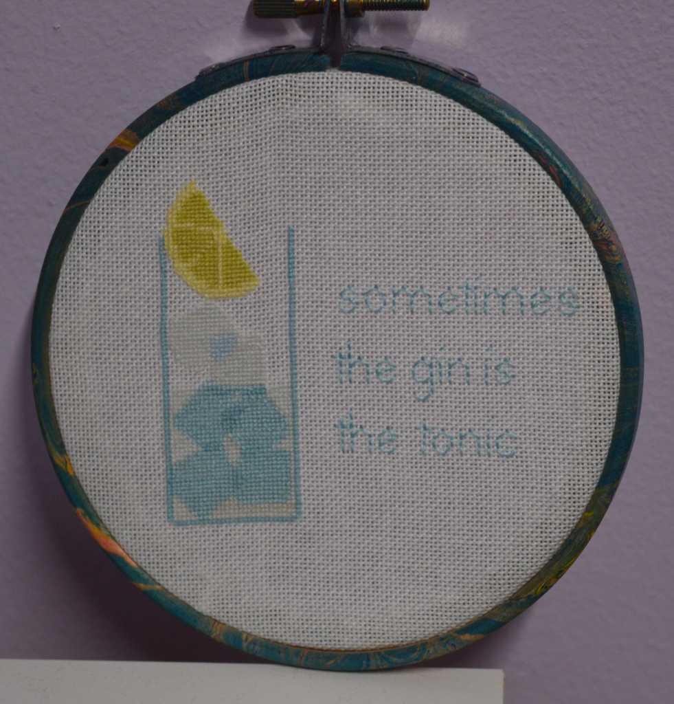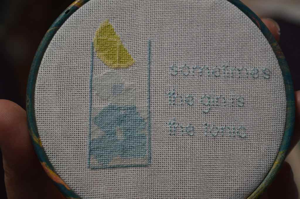 The colours haven’t come out quite as crisp as I thought they would – if I stitched it again I would probably use one shade darker for the overlapping ice-cubes and a darker shade for the writing. I do like the slice of lemon though!