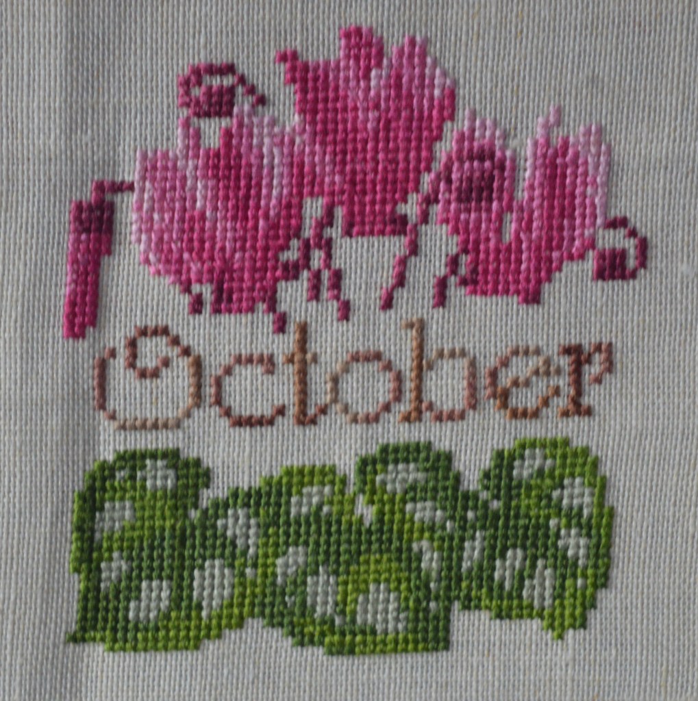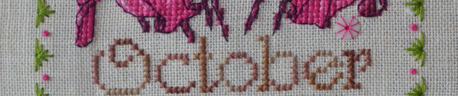 In the last couple of days I’ve finished the October design for the Anthea SAL by Faby Reilly. I would have finished it a few days before only I mislaid the dark maroon I needed for back-stitching the flowers, I searched high and low, whilst being aware that this was a well travelled stitching – it’s been to Northumberland and to work, so the potential for it not being in the house was there. In the end I bought another one…and then of course it turned up – it had been through the wash and the tumble dryer!!!