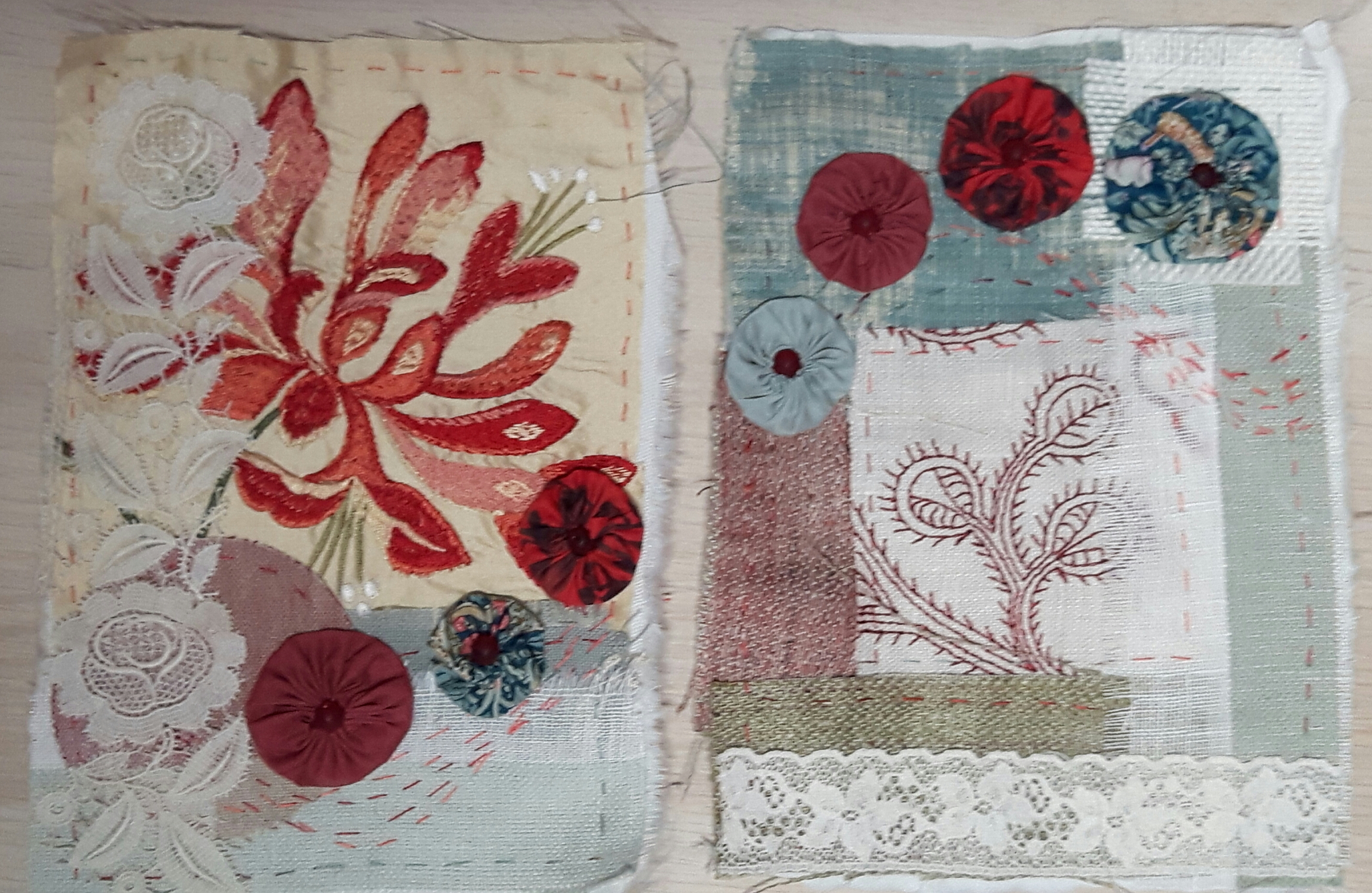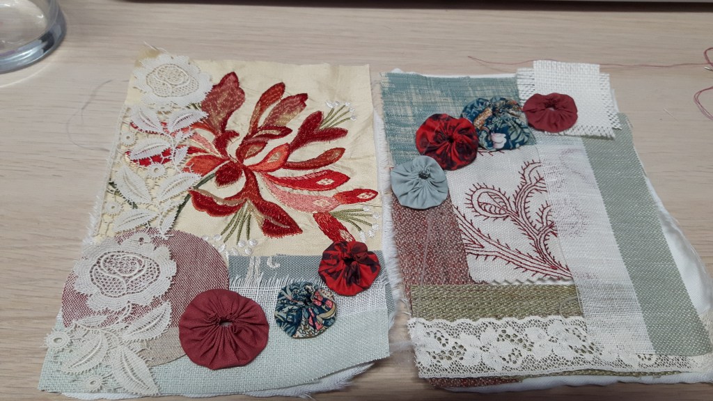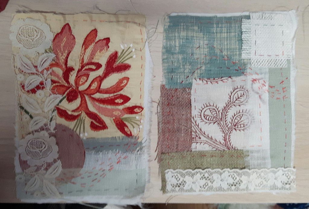 I cut various squares and strips of different weights of fabric from the sample book, frayed some edges and started playing with them, I pulled out some lace and various trims and started to play with potential layouts. I find it difficult not to follow Annes design closely, it’s always interesting to see at which point you veer off and make it your own.