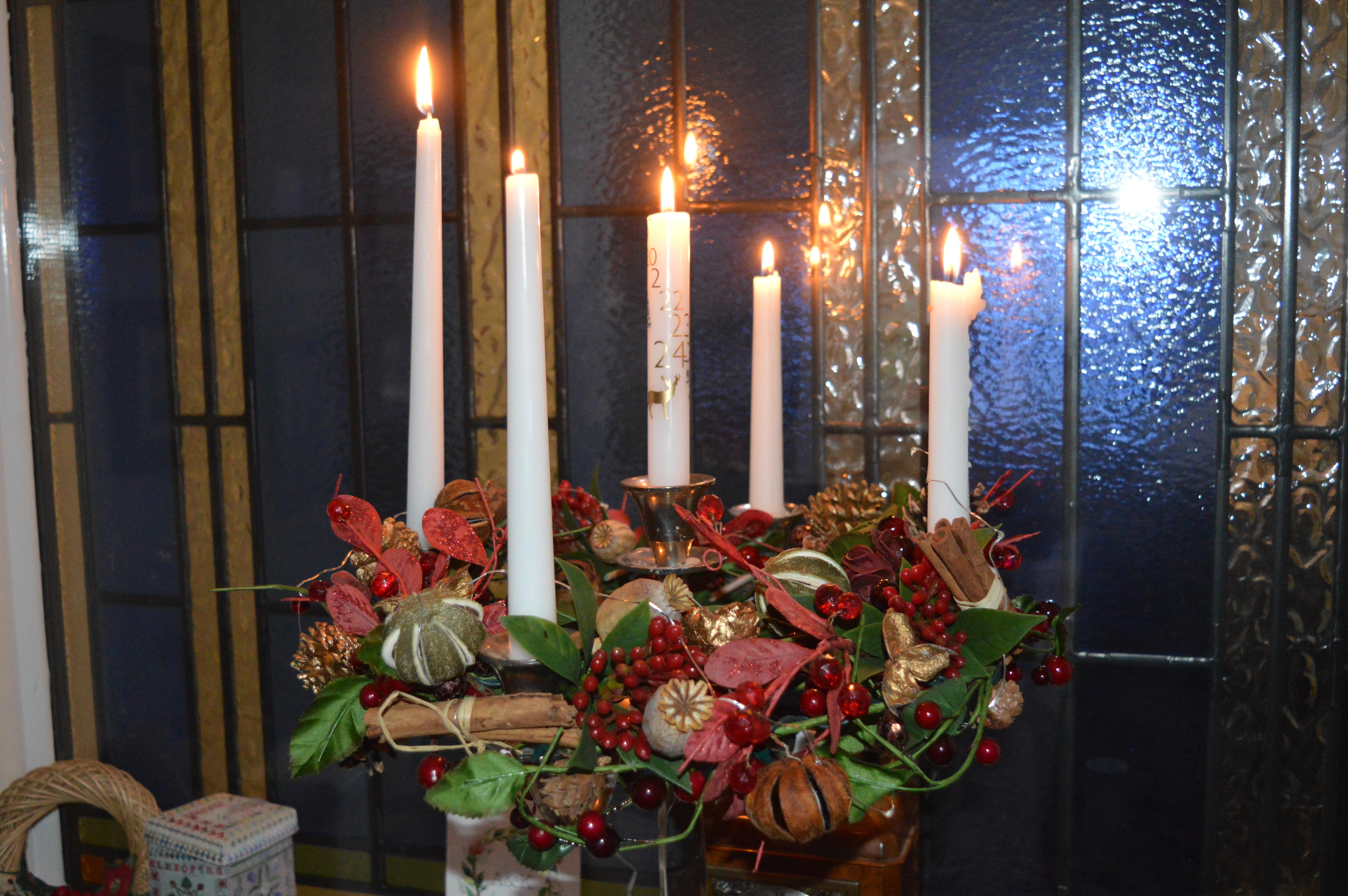 It’s the first Sunday in Advent at the end of November, we always have an Advent ring which has four candles on a foliage wreath, the idea being that you light a candle on the first Sunday, then two on the second Sunday etc etc. In the past I’ve used an oasis ring as a base, which works really well but it’s totally unecological as it never breaks down! Last year I tried a straw based wreath but the foliage died too quickly so I replaced it with an artificial wreath which I bought years ago, titivated up with lots of other bits and bats, it looked great. So that’s what I’m doing again this year…I just didn’t quite get round to it on Sunday!! To give you an idea, this was last years…