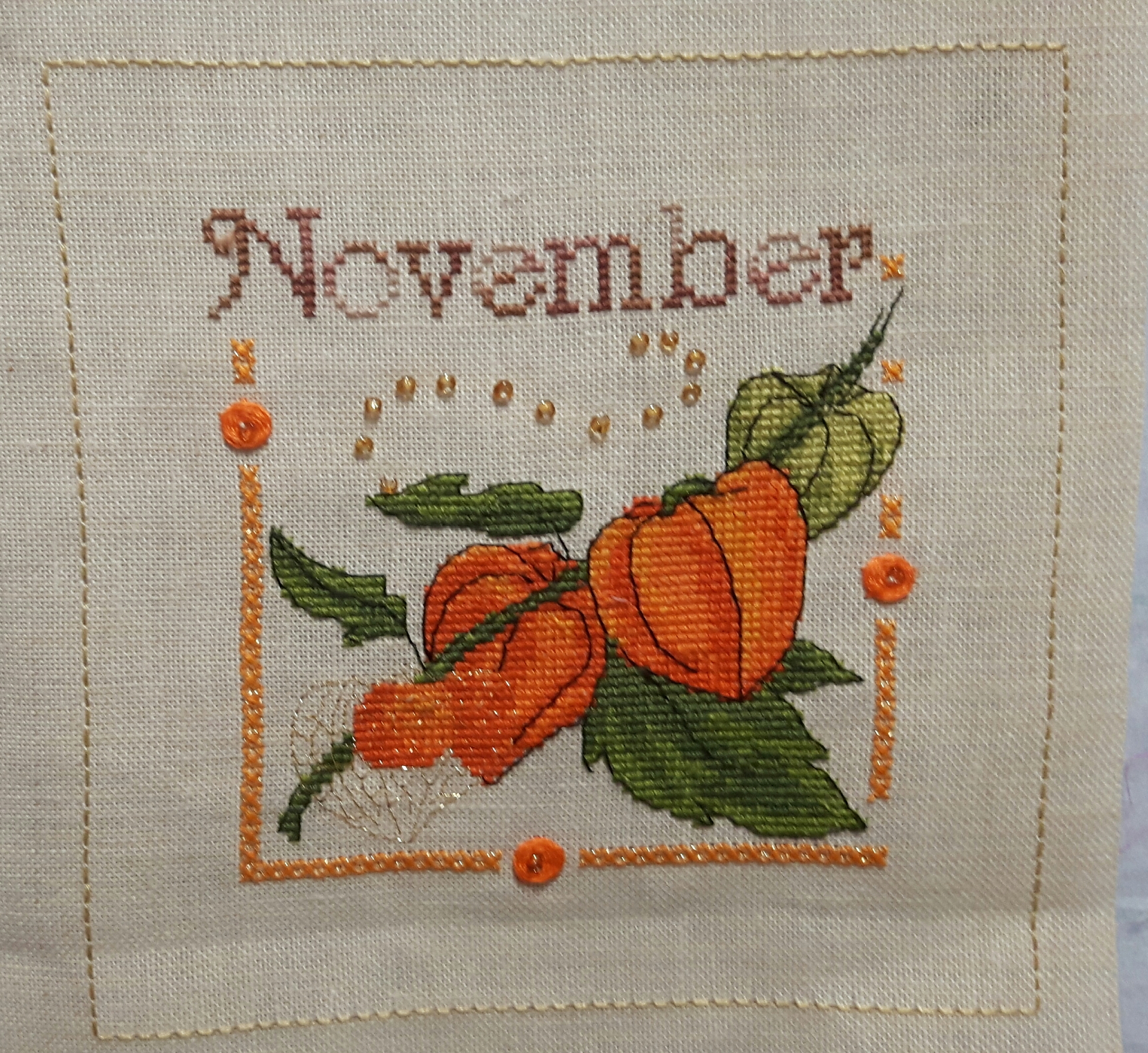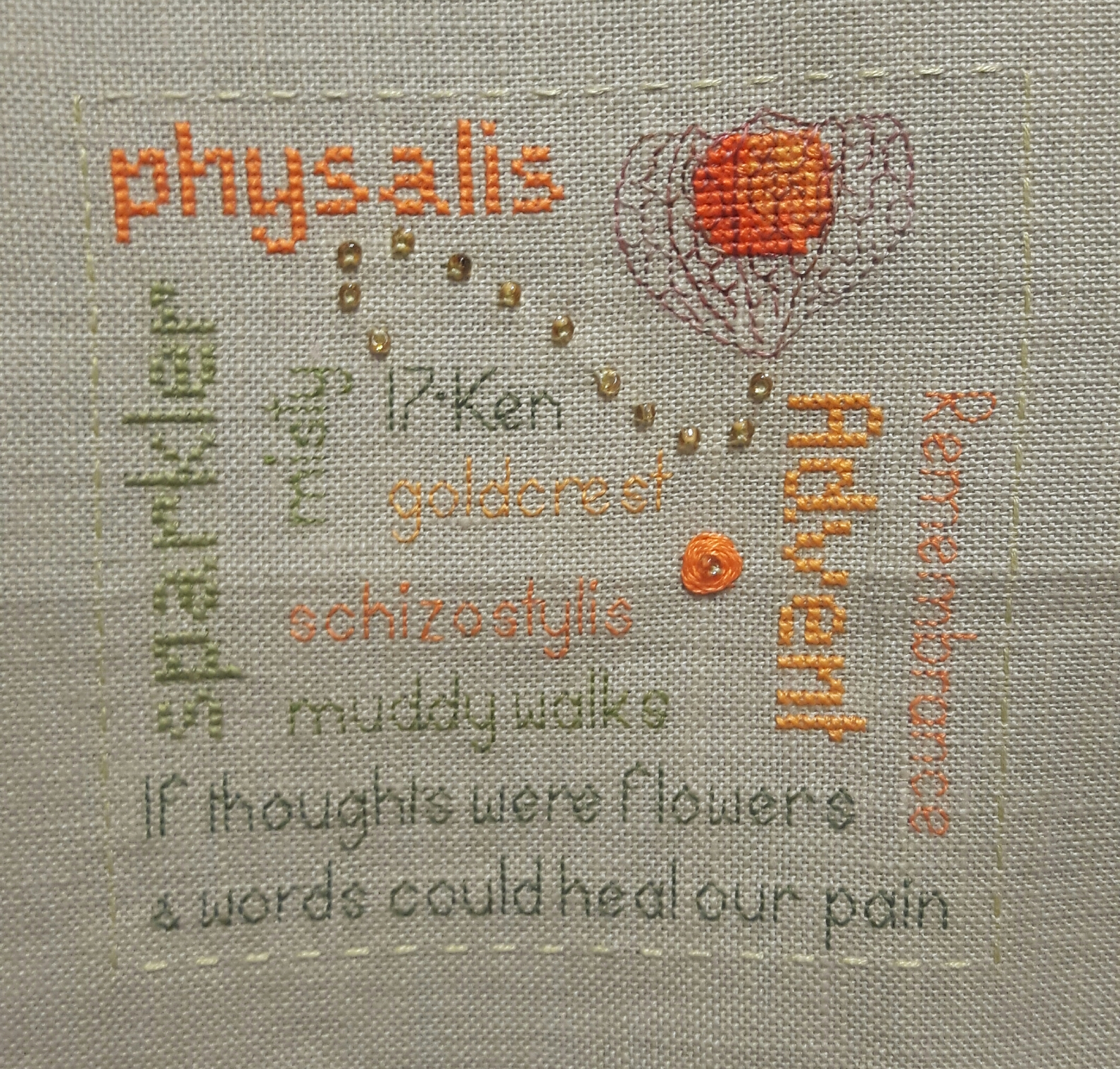 Over the last couple of days I’ve stitched the wordplay to go opposite the flower page for November in my Anthea SAL book. The SAL is organised by Faby Reilly and her designs are beautiful. This was the penultimate month of this SAL and the flower was the Chinese Lantern, or physalis, which has unusual round flowers which become like skeleton leaves as they age.