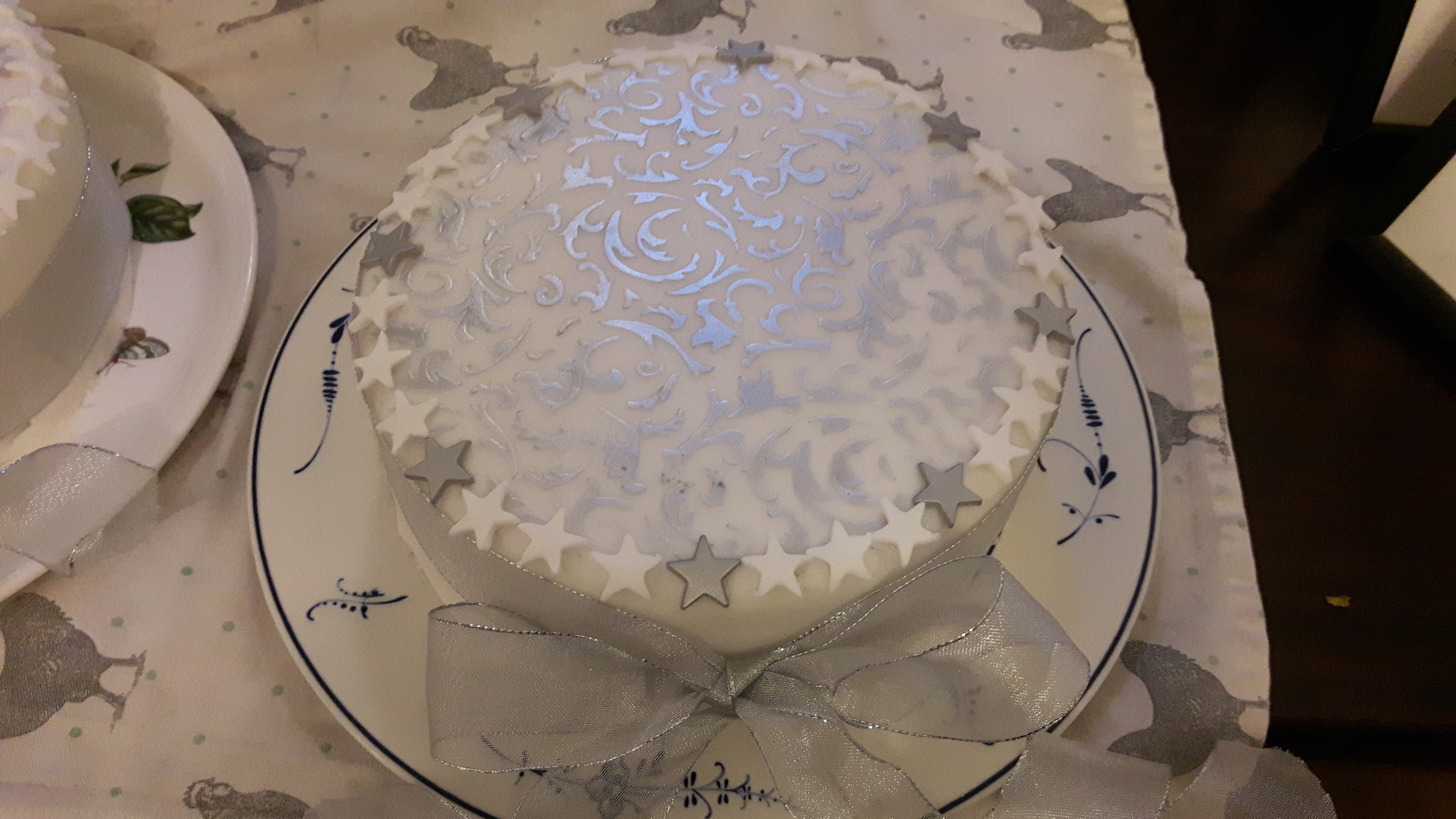 It does vary how easy or hard it is to think of words for a particular month, I was surprised to have more than enough ideas for November especially as we haven’t really done anything! Dates I didn’t have room for include Mischief Night on 4th November, this is more of a northern England thing I think where kids play pranks like knocking on doors and running away, it seems to have been superceded by trick and treat for Halloween. The last Sunday before Advent is called Stir-up Sunday, It got its name from the beginning of the collect for the day in the Book of Common Prayer, which begins with the words, “Stir up, we beseech thee, O Lord, the wills of thy faithful people”. This was taken as a sign or a reminder that it’s time to make the Christmas cake and pudding as both need to mature for several weeks. My cake is now made and decorated with a simple stencilled top and a few stars.