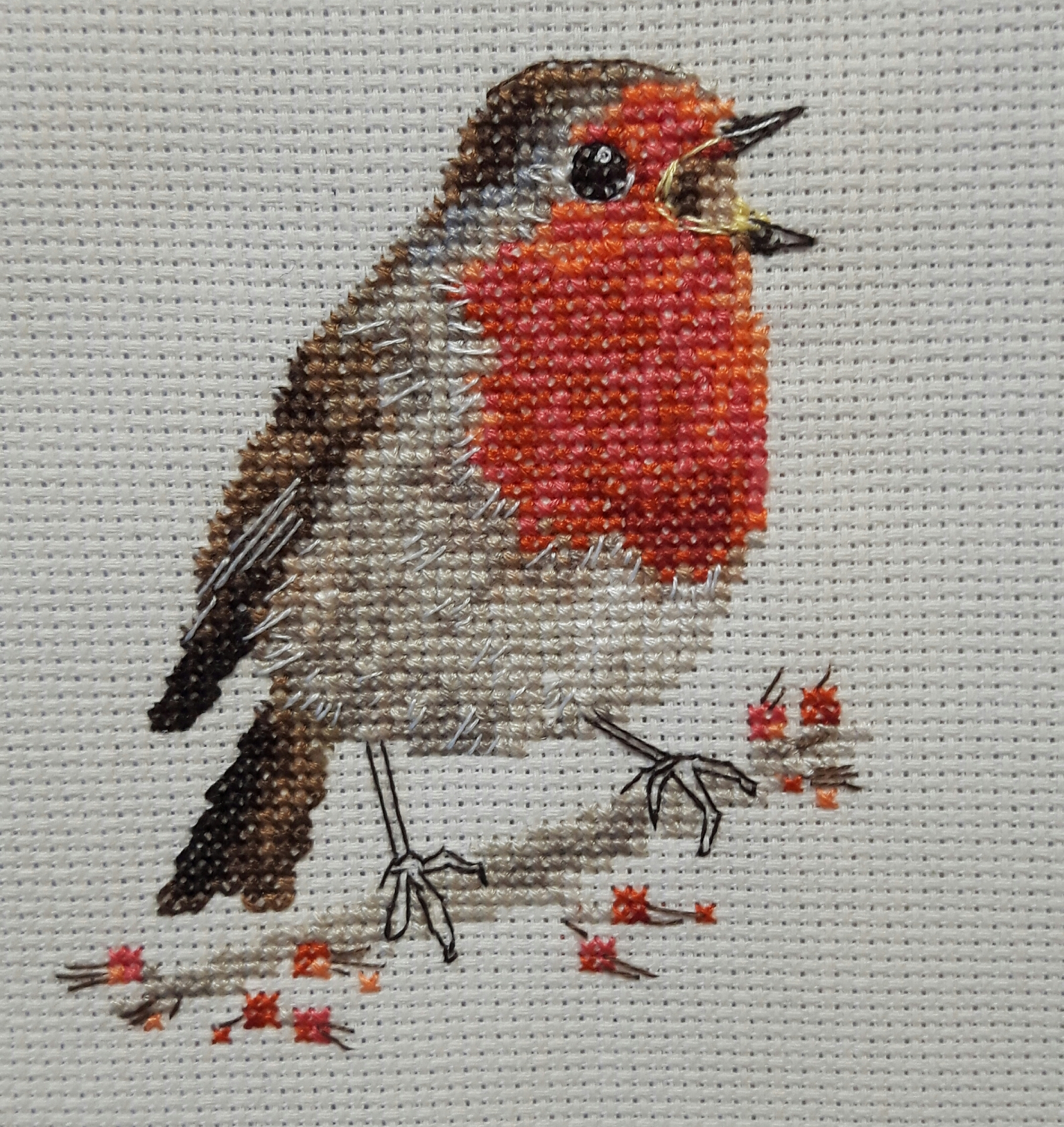 I started this one whilst I was in hospital between Christmas and New Year. My daughter was packing a bag for me and asked what stitching I would like – she knows me well! I had three of these bird kits in my stash so I asked her to choose one and bring it in. She chose a pretty robin singing it’s beautiful song.