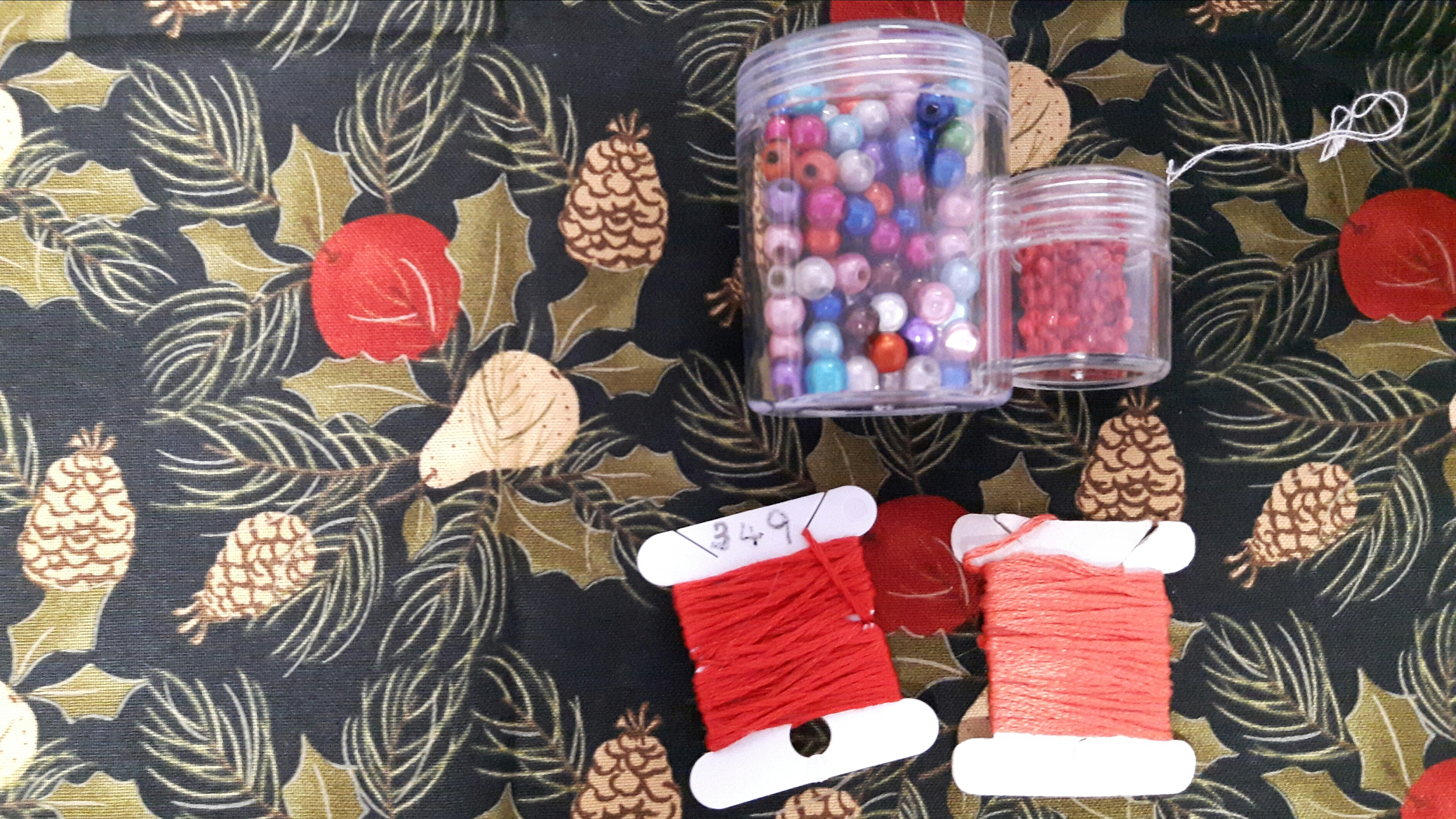 I found some fabric in my stash which seemed to go OK, it’s a Christmas one but not too Christmassy. I also found some embroidery threads to make a cord from and some beads to titivate with.