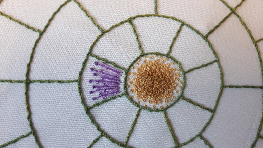 I’d stitched the outlines of the wheel, together with the first two stitches, french knots and pistil stitch.