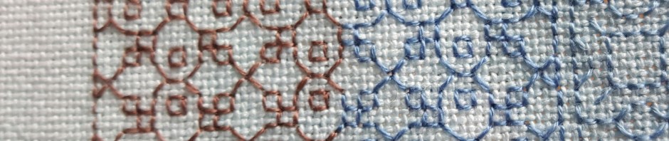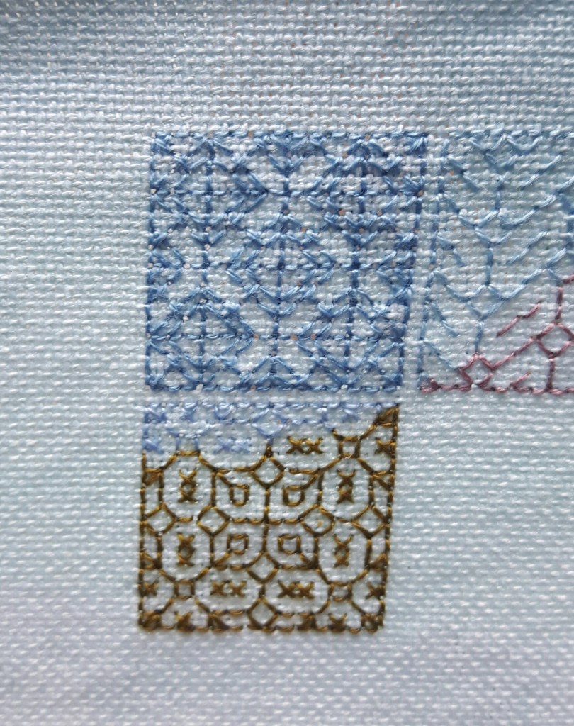 The squares are only 14 stitches each way, designed to be one inch square on 14 count aida, mine are slightly smaller as I’m using 32 count linen. Being little they don’t take long, but I do have to concentrate!