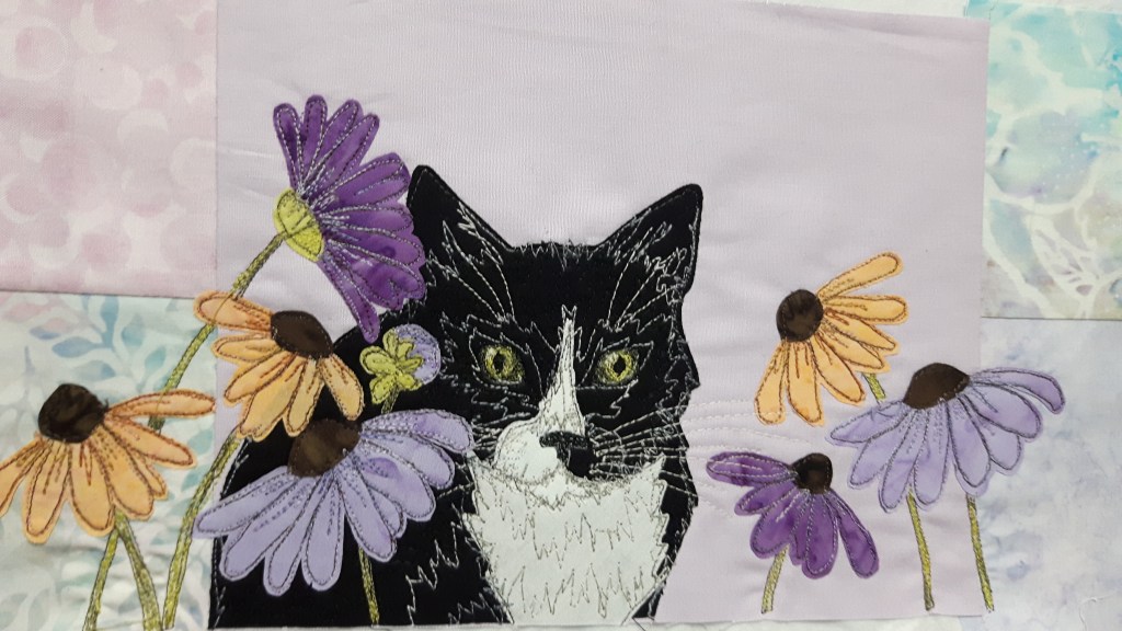 As this was a fairly small panel I decided to experiment a bit. Andrea doesn’t use any adhesive in her panels, she cuts out using freezer paper and just holds the pieces in place and stitches them down, on the quilt above I did use tiny dots of fabric glue to just help a little. This time I decided to try it with bondaweb, it would keep everything secure, the downside being that it reverses everything. I decided with the flowers it didn’t matter and with the cat I attached the bondaweb to the fabric and then ironed on freezer paper with the design traced on, so the cat was the right way round.