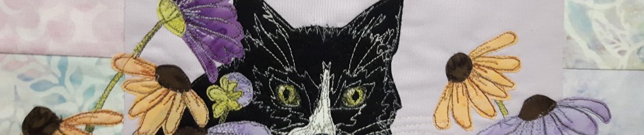 As this was a fairly small panel I decided to experiment a bit. Andrea doesn’t use any adhesive in her panels, she cuts out using freezer paper and just holds the pieces in place and stitches them down, on the quilt above I did use tiny dots of fabric glue to just help a little. This time I decided to try it with bondaweb, it would keep everything secure, the downside being that it reverses everything. I decided with the flowers it didn’t matter and with the cat I attached the bondaweb to the fabric and then ironed on freezer paper with the design traced on, so the cat was the right way round.