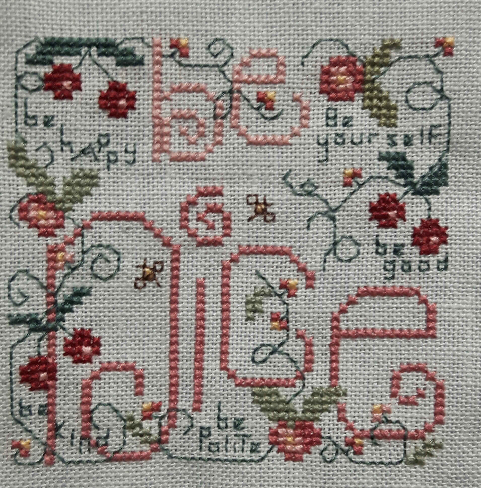 I’m trying to work my way through my stash of kits and patterns (preferably quicker than I buy them!) so after I stitched the nuthatch I had a change of scene from the bird kits and found a Shepherds Bush pattern which I think I bought last year from a destash site. It sounds like a new one as it’s called ‘Be Nice’ and there’s been a lot of Bee Safe and such like but this one is actually from 2006.