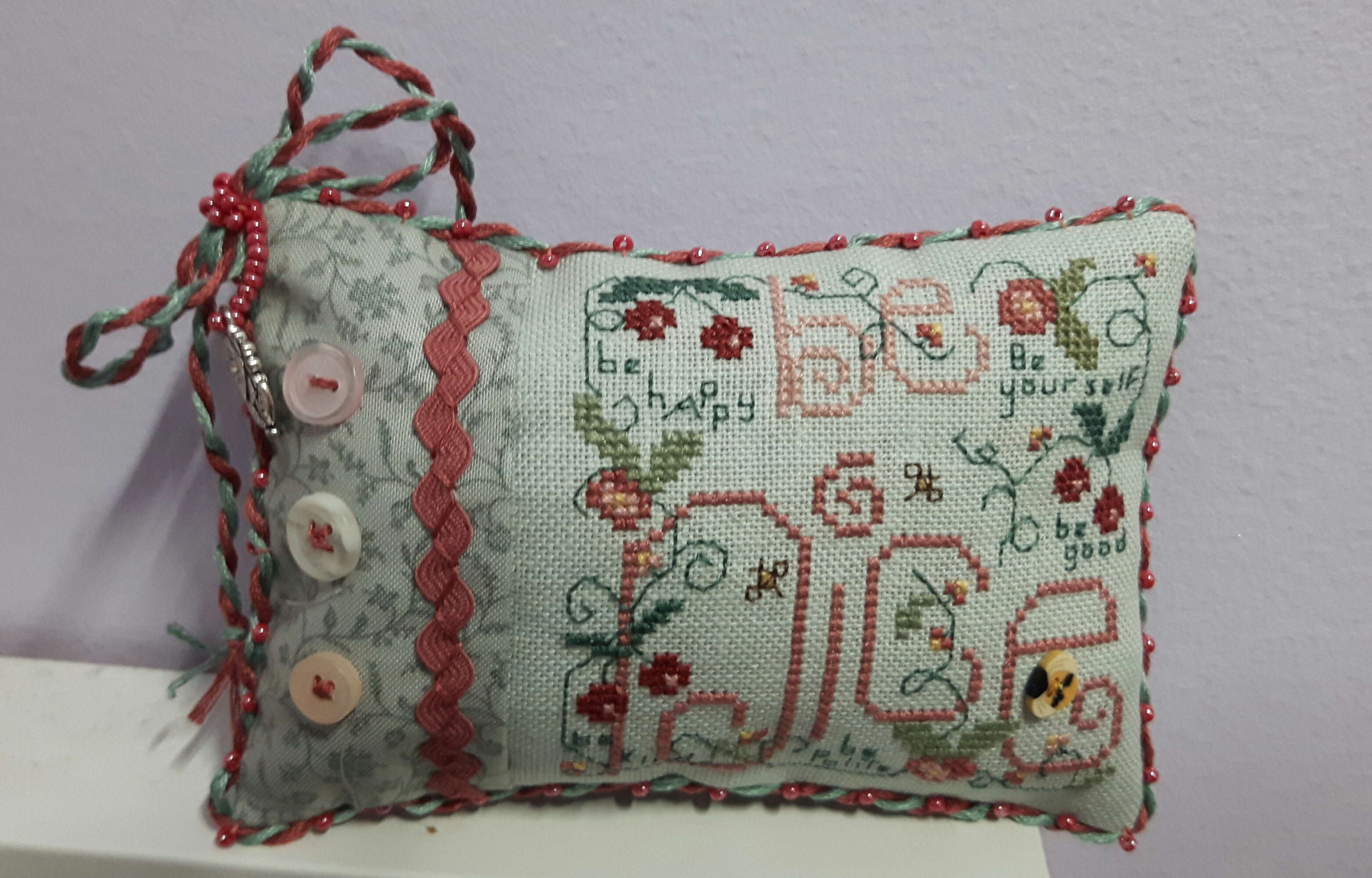 It’s a very pretty design with pink lettering, flowers twining round and bees buzzing round too. It was pretty quick to stitch as well. The original design has lots of JABCO buttons (like 8) of bees, flowers, hearts and bees. They’re lovely are the JABCO beads but over here in the UK they are pretty expensive too. I’ve a handful in my stash so I was planning to include one or two, but when I tried them even the tiniest bee was almost too big, probably because I’d used 36 count linen instead of the 11 count aida in the pattern! I decided to just squeeze one tiny bee on in the letter ‘e’.