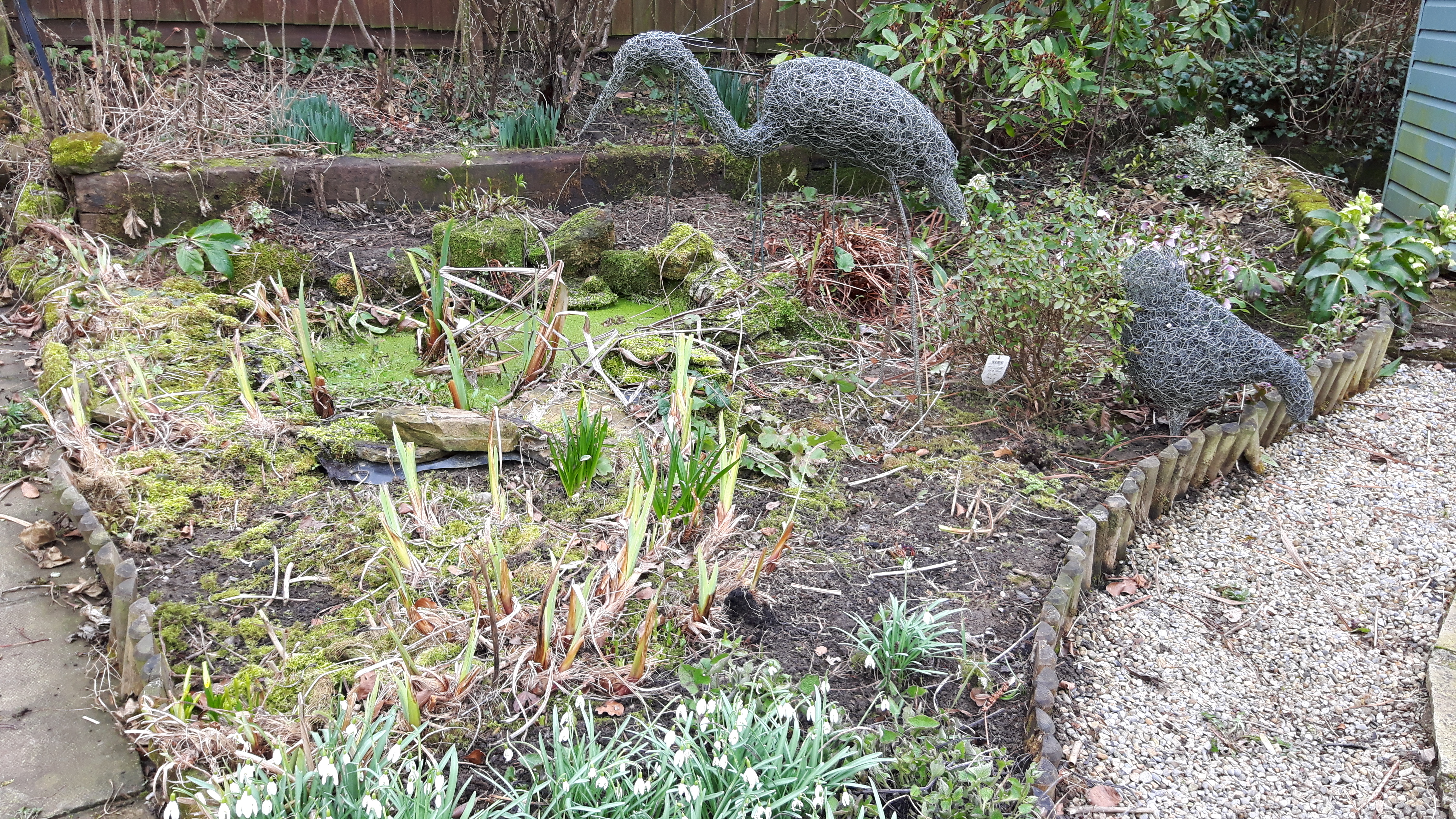 They’re looking happier since I took all the dead hosta and geranium foliage off them at the weekend. The pond area is looking a bit bleak at the moment but give it a few weeks and it will be bursting with foliage again. The pond itself is looking very green, it really needs a good clear out.