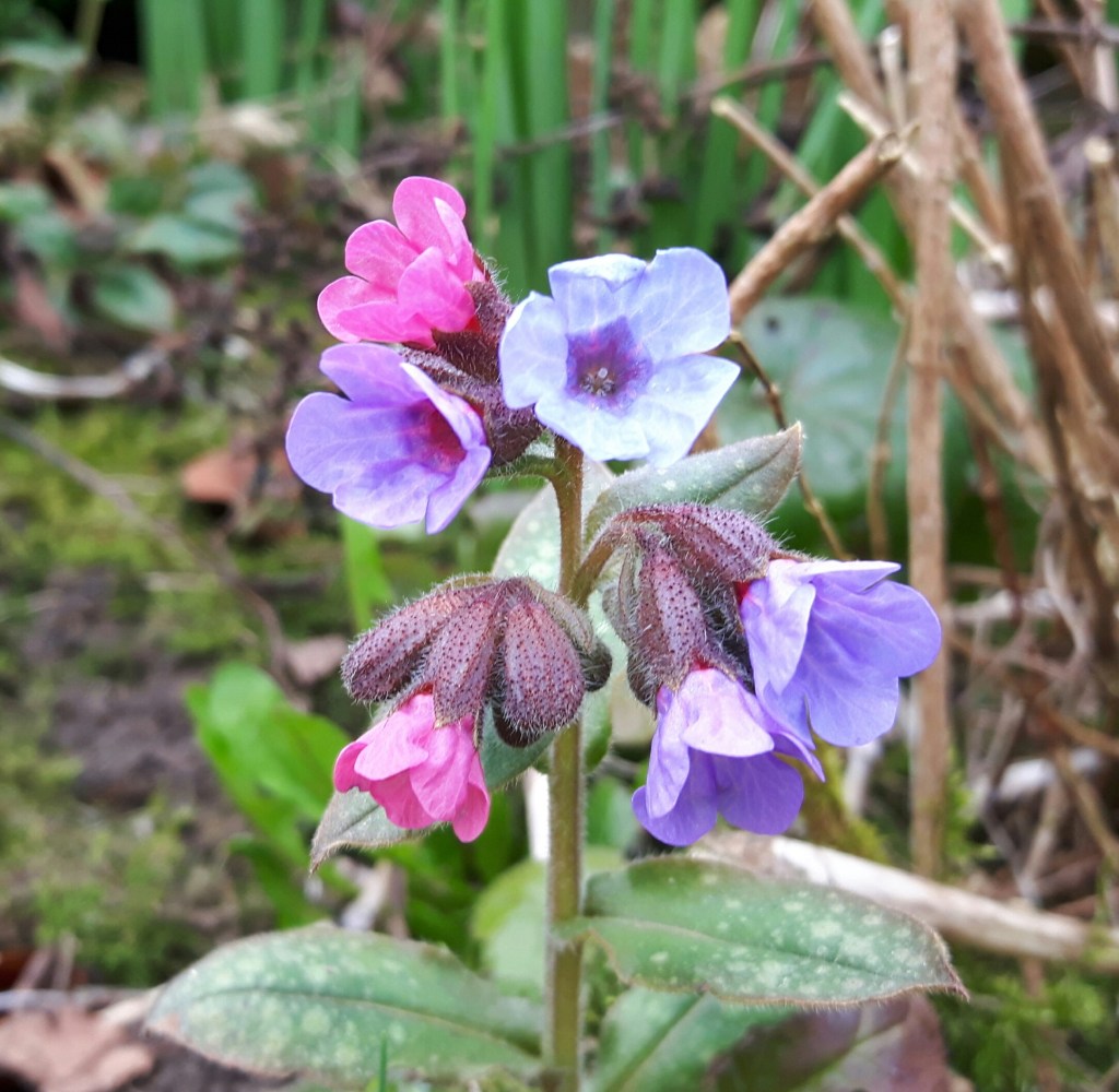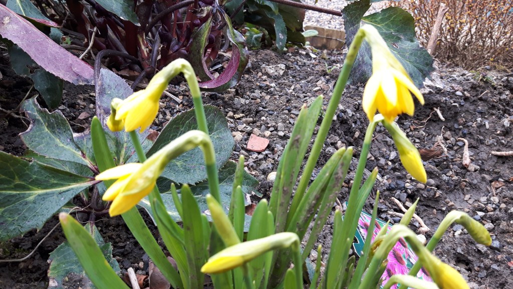 Once you get out in the garden and start to look around, there’s actually quite a bit going on, perenials are starting to push the new growth up, roses and clematis are starting to bud so they need pruning soon. Some of the early daffodils are brightening up the beds, I particularly like the little ones as they aren’t damaged by the wind so easily. There’s a few dots of pulmonaria too, I love the way they have several different shades of flower on one stem.