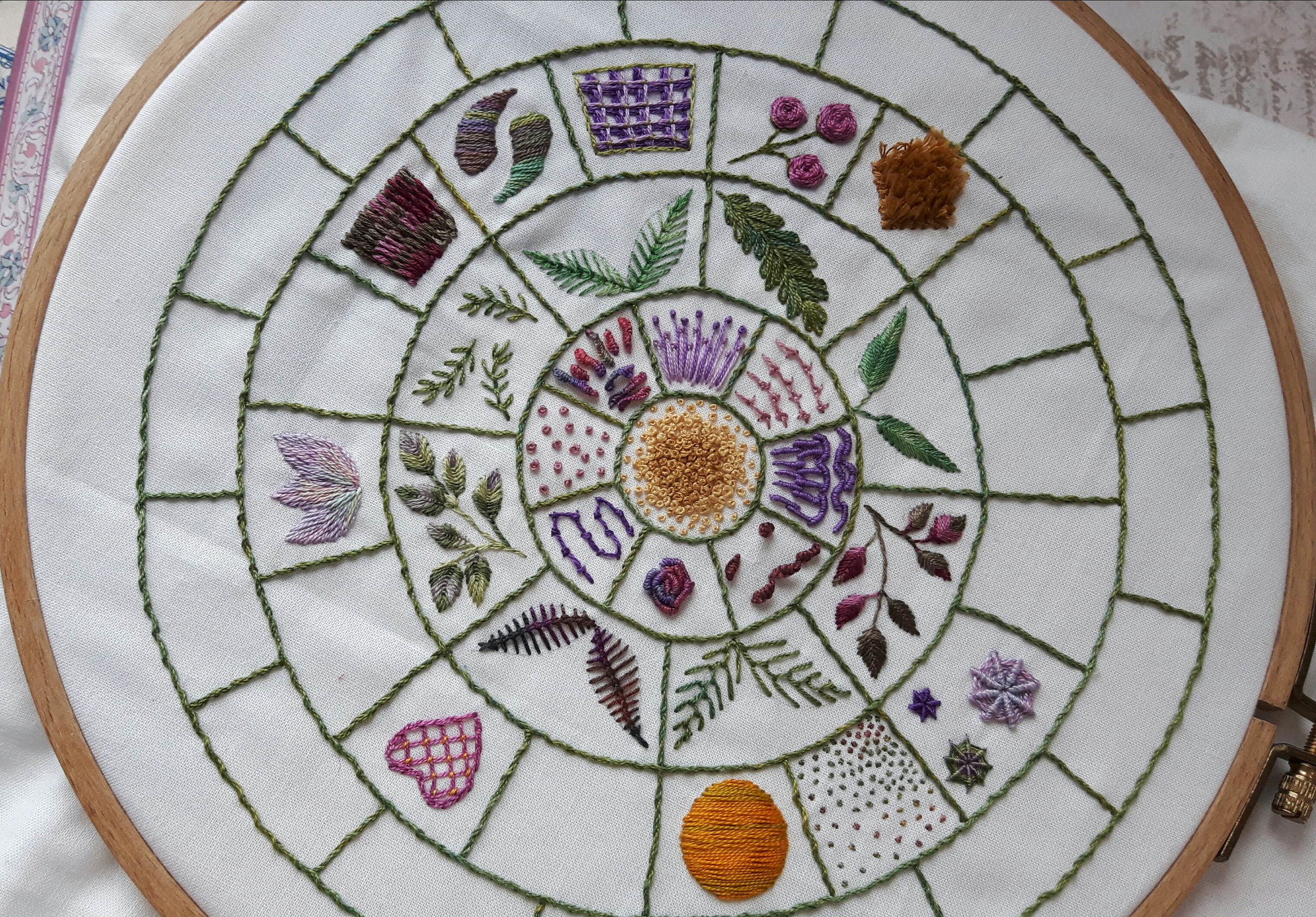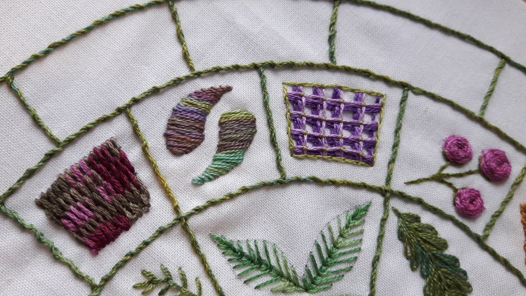 Over the weekend I managed to stitch the three new stitches from Cathy Reavy’s Stitch-wheel Sampler. This is a stitch-a-long on Youtube, she’s now got a facebook page too so we can see how everyone else is stitching the samples and admire all the different colourways.