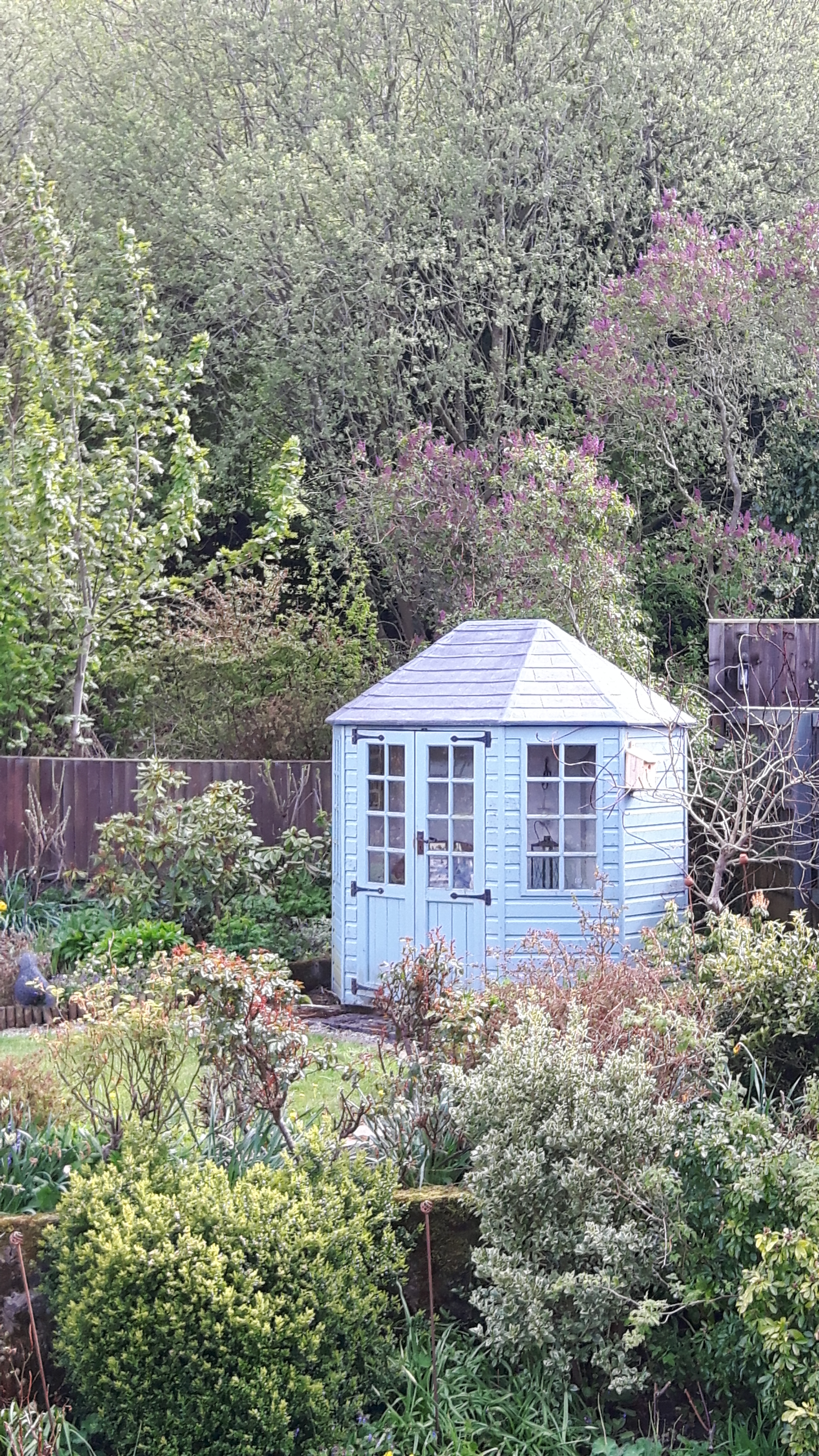 The lilac behind the summerhouse is just coming into flower too, it’s pretty old is this one, they’re not particularly long lived trees, we used to have about four at the side of the drive which the previous owner had planted, one day something made me push against one…and it fell down!! So I pushed against the others and they all fell down! I keep testing this one every so often, I’d rather it fell in a controlled manner rather than suddenly going! They will often sprout again from the base. You can also see in the photo how much the trees behind us are greening up, everything looks so fresh and verdant at this time of year.
