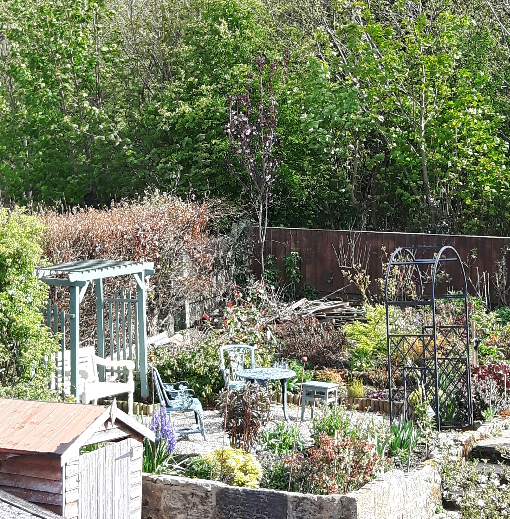 I’m trying to sort out the old compost heap too, so I’ve dug up lots of nettle roots and more bindweed. It’s beautiful compost up there, so once I’ve got all the weeds out I’ll mulch it round the back garden. There’s a big pile of wood to be sorted up there too. In the corner there is a flowering cherry, you can just see it in the photo below of what my OH calls the beer garden!! I planted it a few years ago, at the moment it seems to be growing upwards rather than out, but I’m sure it will fill out in time. I’m hoping in time it will be quite spectacular, it has bronze foliage and good autumn colour too so a real all season interest tree.