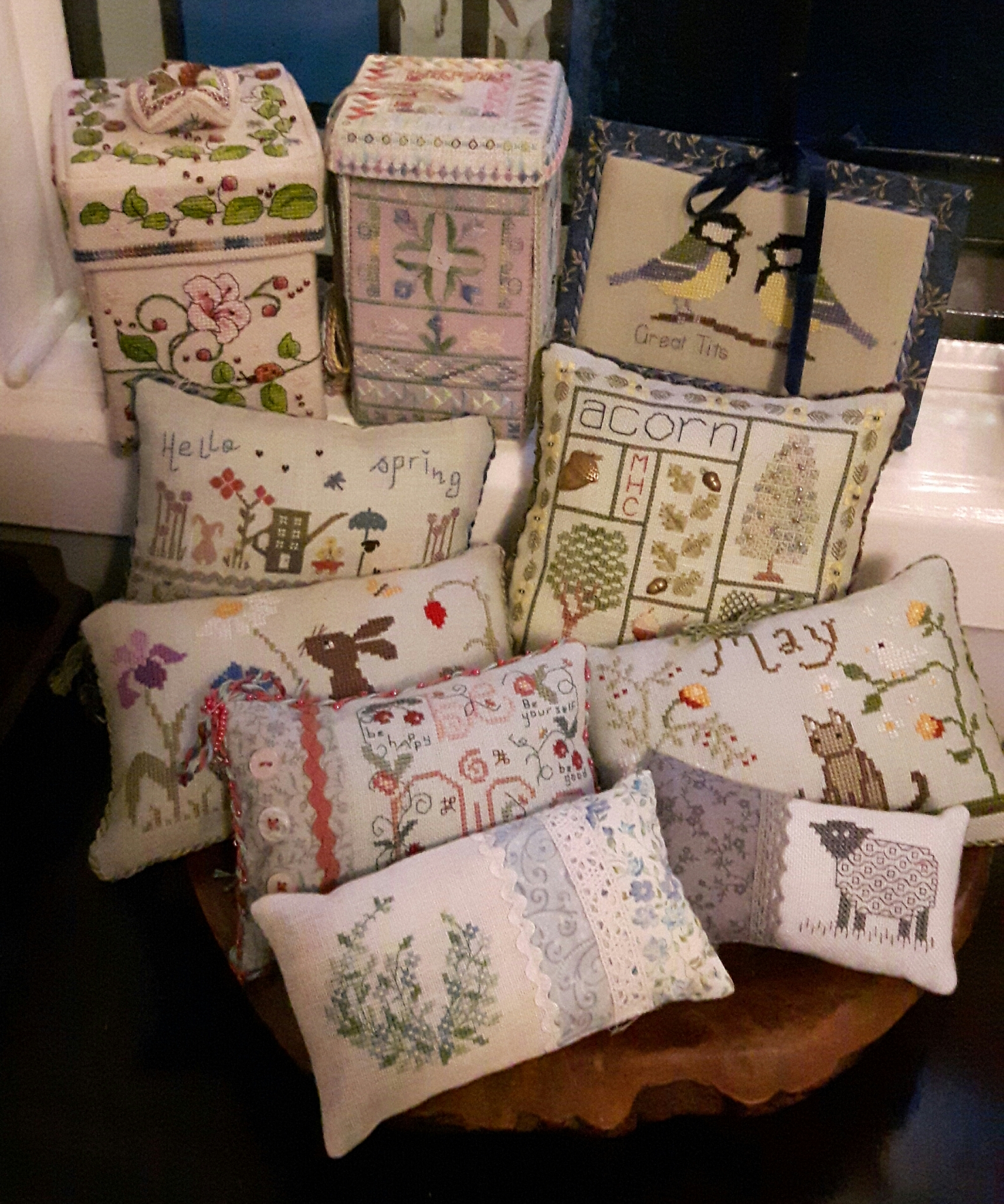 The small for May is from a free SAL by Snowflake Diaries and at the back as usual there’s the spring sides of the Zoe box by Faby Reilly and the etui by Betsy Morgan. The cross-stitch of great tits was an anniversary card for my OH a couple of years back.
