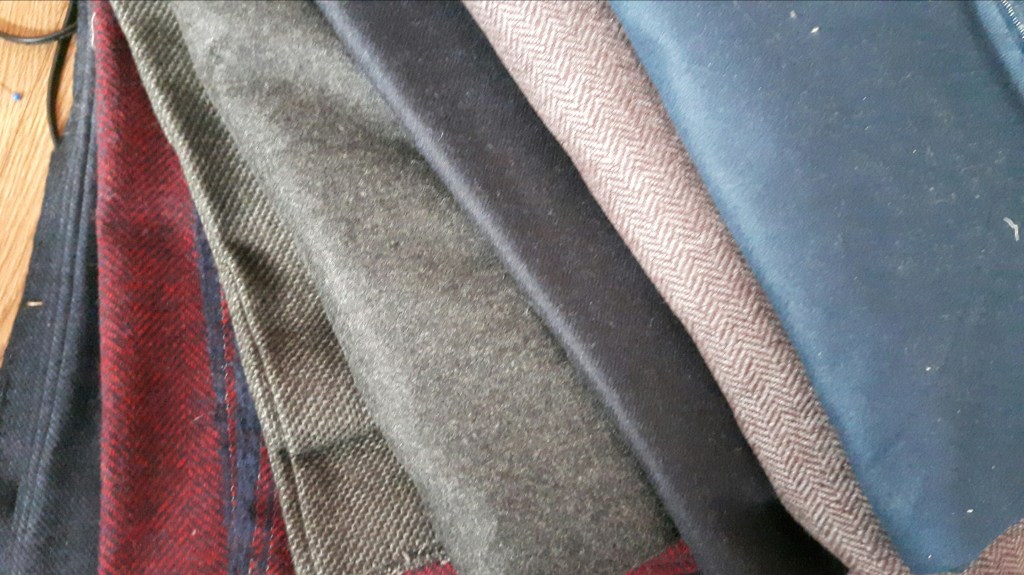 On the way home we called into the Abraham Moon factory shop. It’s only about a 5 minute drive from home and is well worth a visit. Abraham Moon weave beautiful woolen cloth for the upmarket designers, it’s quite trendy now, usually it’s around £40 a metre at least, in the factory shop everything is £20 a metre. However when we arrived they had a display of roll ends…at £5 a metre!!! They were all 2-3m lengths, perfect for skirts, coats, jackets etc. Well I got quite a few, it was too much of a bargain to miss! I bought £80 worth of wool, 16m, even in their mill shop that would usually have been £320!!!