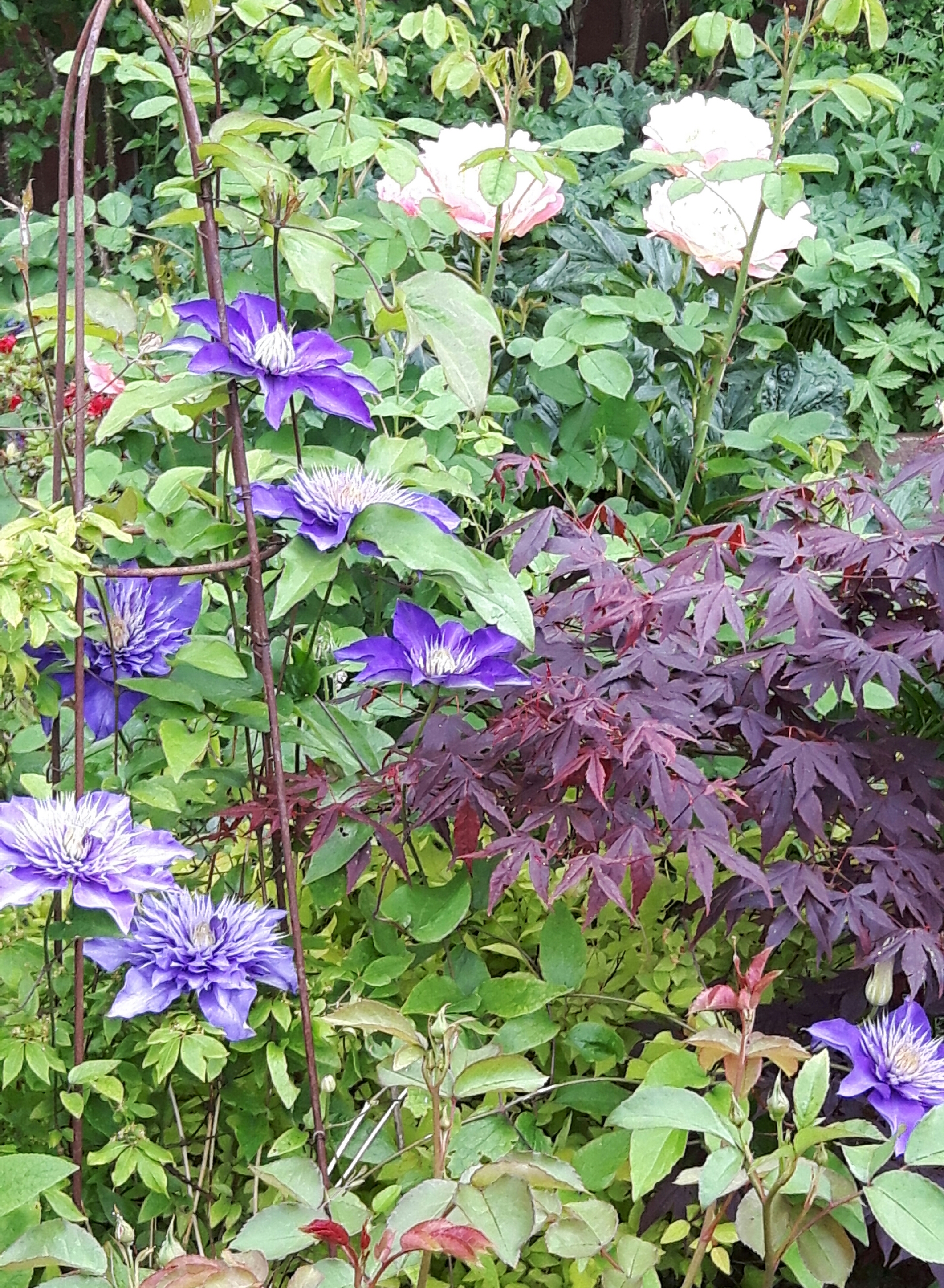 The clematis I’ve planted in the last few years are starting to make an impact. This one is climbing up one of three obelisks in the autumn border. It’s starting to mingle round the neighbouring plants as well as up the obelisk.
