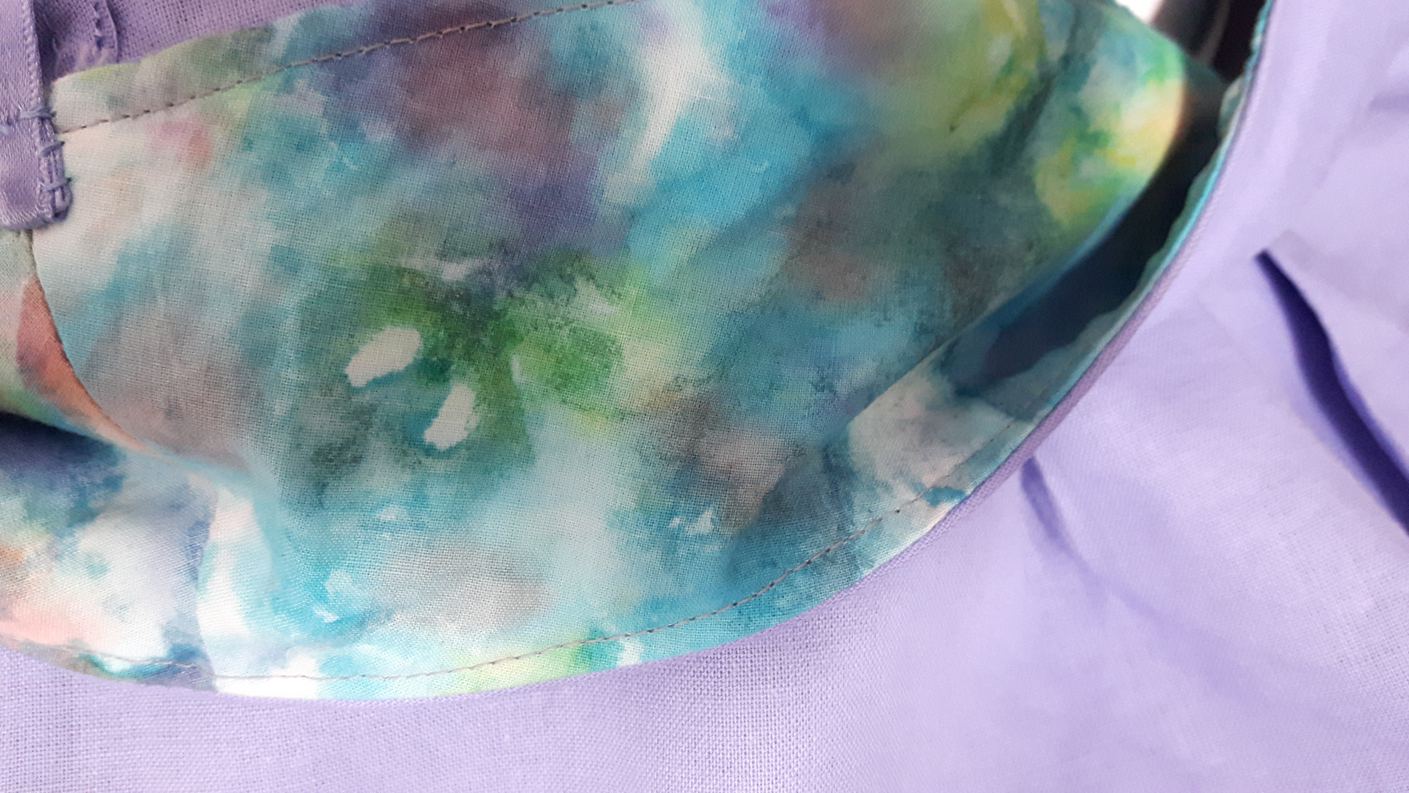 I used a leftover piece of batik for the pockets and the inside of the waistband. It’s pretty and a bit softer to the touch than the purple cotton.