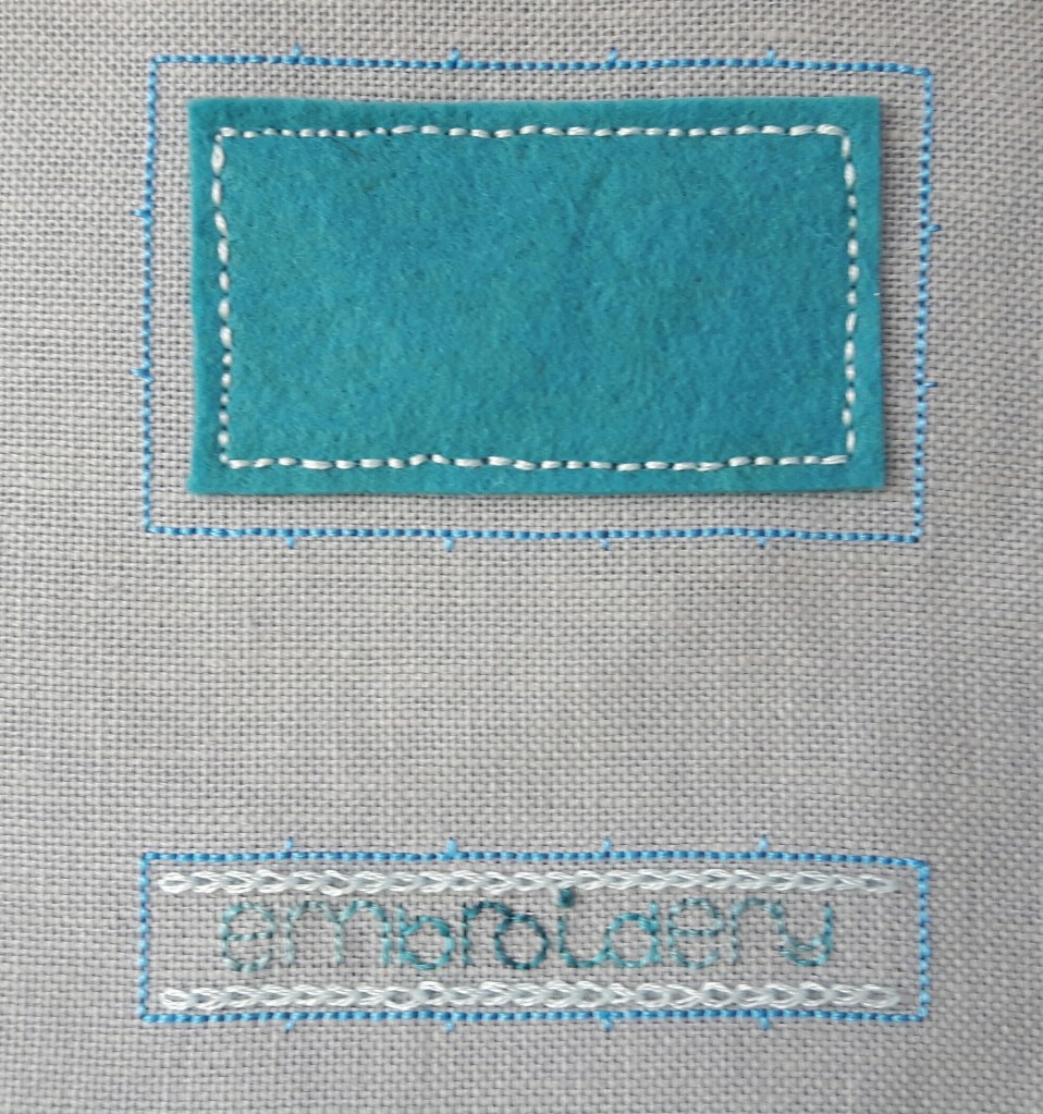 This first week is stitching the felt inserts and labels, I’ve managed to stitch one felt insert (there’s four altogether) and one of the labels so you get the idea of what I’m doing. The other label is cross-stitch. Despite measuring carefully my felt rectangle was a milimetre short on one length and I have only just got enough for the four squares in this lovely kingfisher blue, so I trimmed the other side slightly too so at least it looks even in the block.