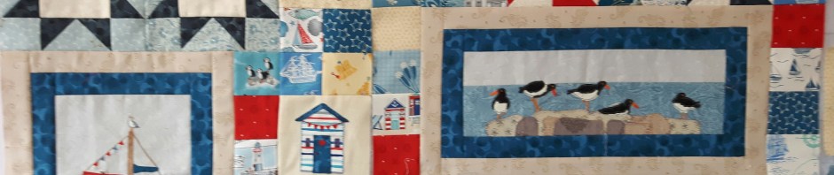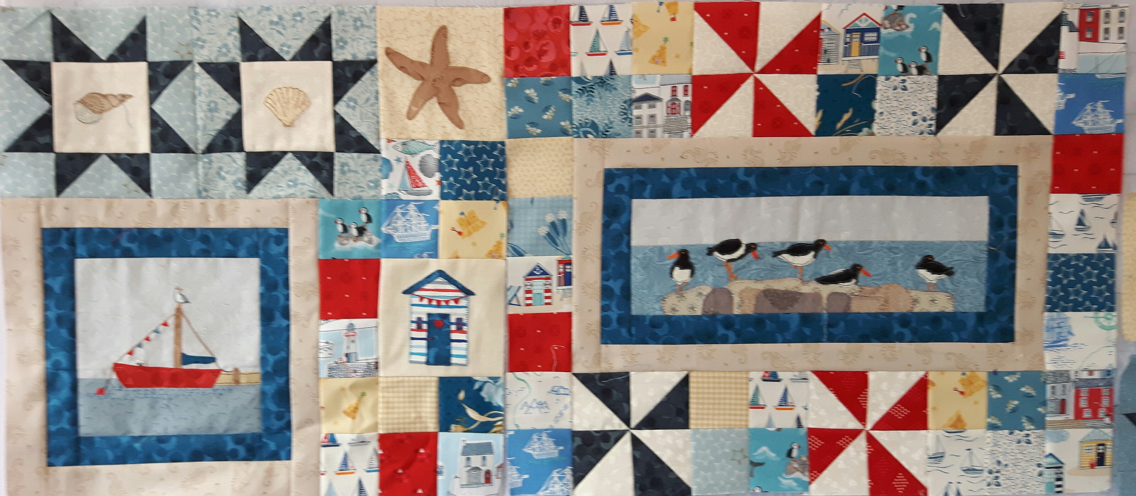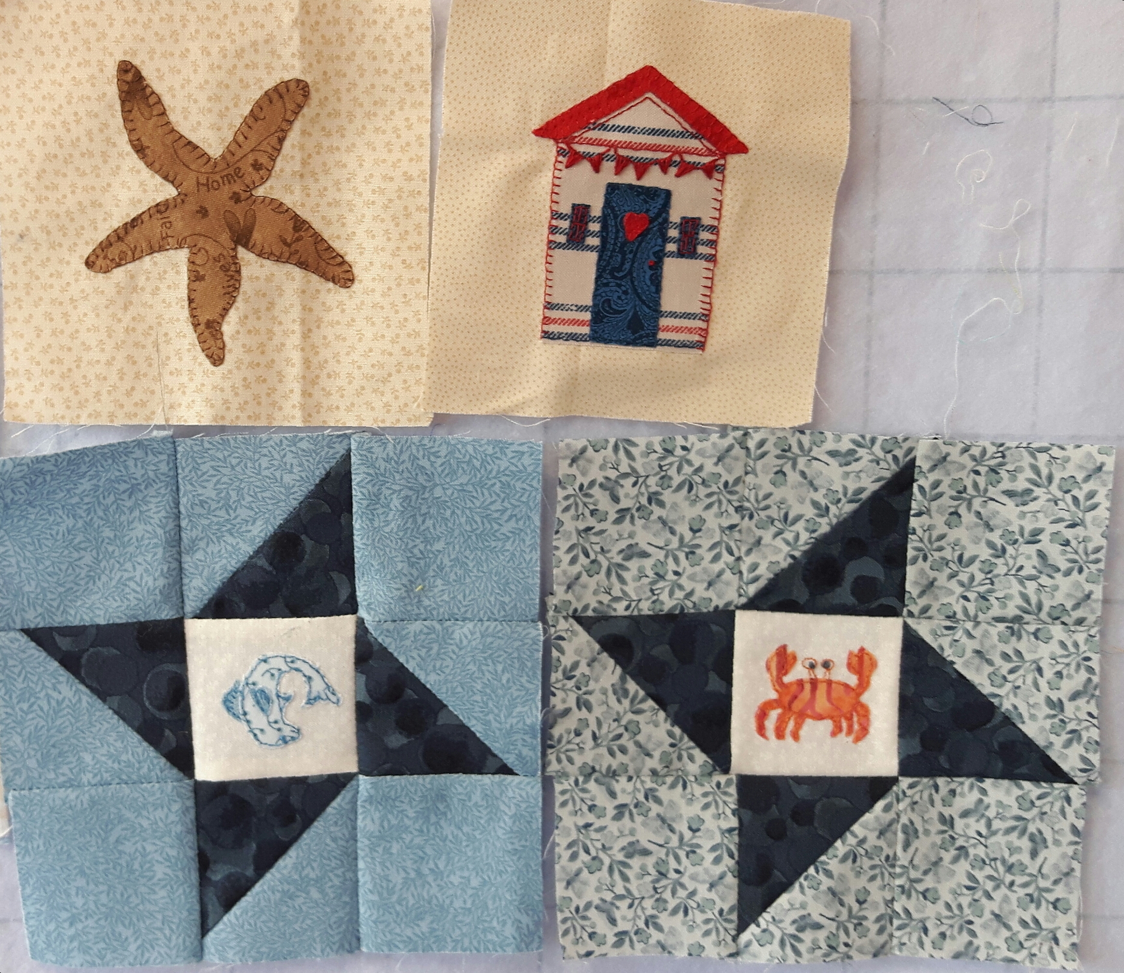 The final section of the top row had another set of beach hut and starfish blocks together with some friendship stars with a dolphin and a crab on. I actually embroidered these last two a while ago whilst we were up in Northumberland. With hindsight the dolphin would have been better in a plainer fabric as much of the detail is lost, but he’s staying!