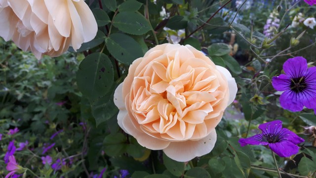 The border by the big fence is really filling out, I struggle to get in to weed now, but the bindweed keeps sneaking up so I shimmy behind the purple cotinus and try and attack it from the back. There’s a nice mix of plants here, peony, day lily, astrantia, geranium, roses – these ones are called Darcey Bussell.