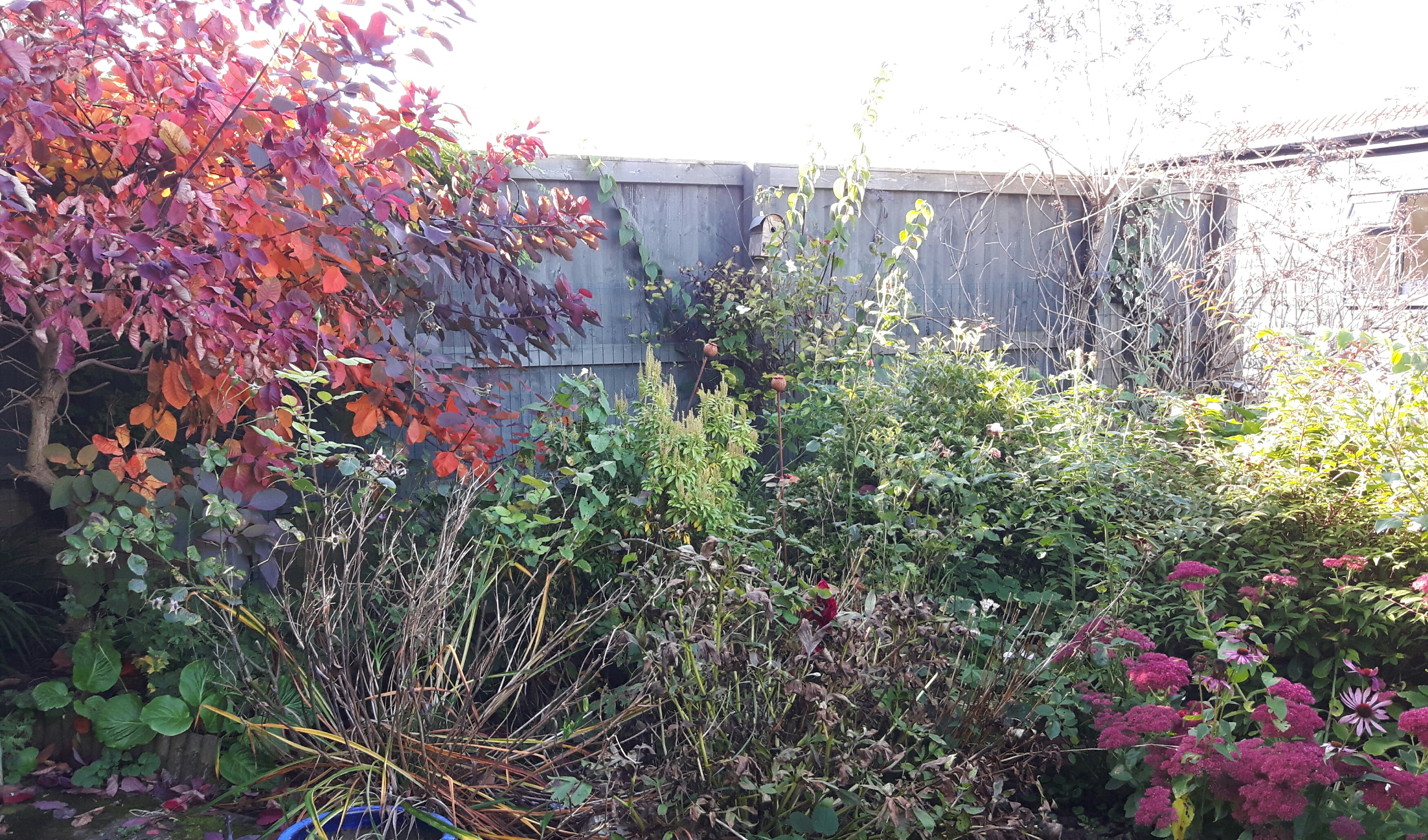 Up by the summerhouse at the top of the garden the cotinus coggrhia is a gorgeous mix of reds and oranges. As you can see I haven’t started tidying this bit yet! The sedum is a lovely shade of dark pink at this time of year, it really needs splitting when I get round to doing this bit. It’s flopping in a huge circle and apparently that is a sure sign that it’s getting over crowded.
