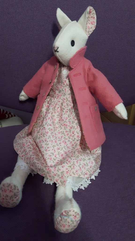 As it’s so cold at the moment Miss Mouse needed a coat, I bought some lovely dusky pink felt from Cool Crafting whilst I was at the Knitting and Stitching Show in Harrogate. I decided to make the Luna ‘corduroy coat’ as it didn’t have quite as much detail as the one I made before for Luna. It is, however, a fully lined, bagged out coat! I usually avoid bagging out coats like the plague as it’s so easy to get it slightly wrong and it doesn’t hang right! For the non-sewers, bagging out is where you stitch the lining to the coat right round the edge, hem to neckline and back round, and then turn it out through a gap in the side seam…all whilst keeping your fingers crossed that it will come out OK! I decided to brave it with a mouse-size coat and it has come out fine!