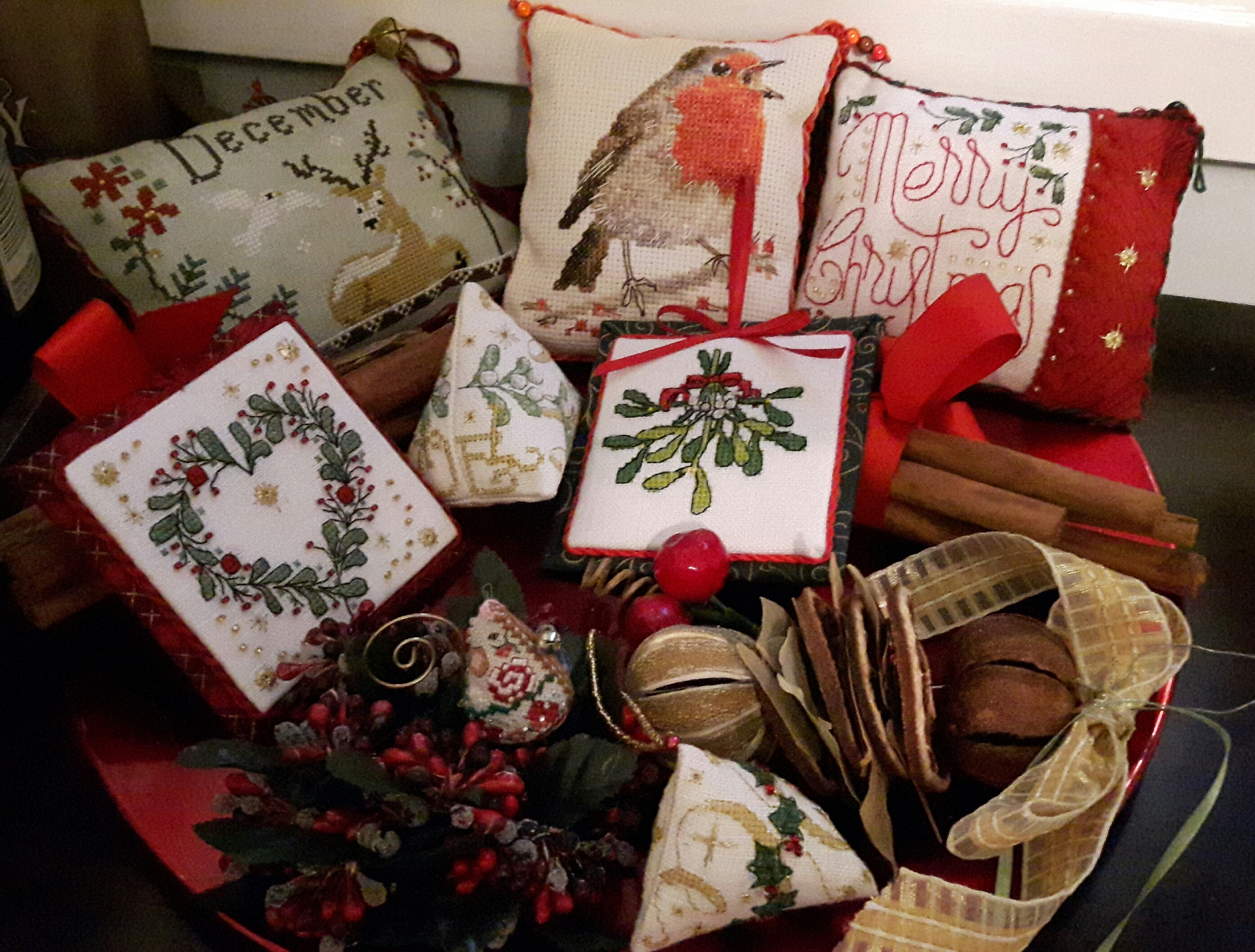 Each month I try and have a seasonal display of cross-stitch smalls, I’ve made a box full so it does mean they all get a chance to be on display. Obviously this month it’s all my Christmassy ones.