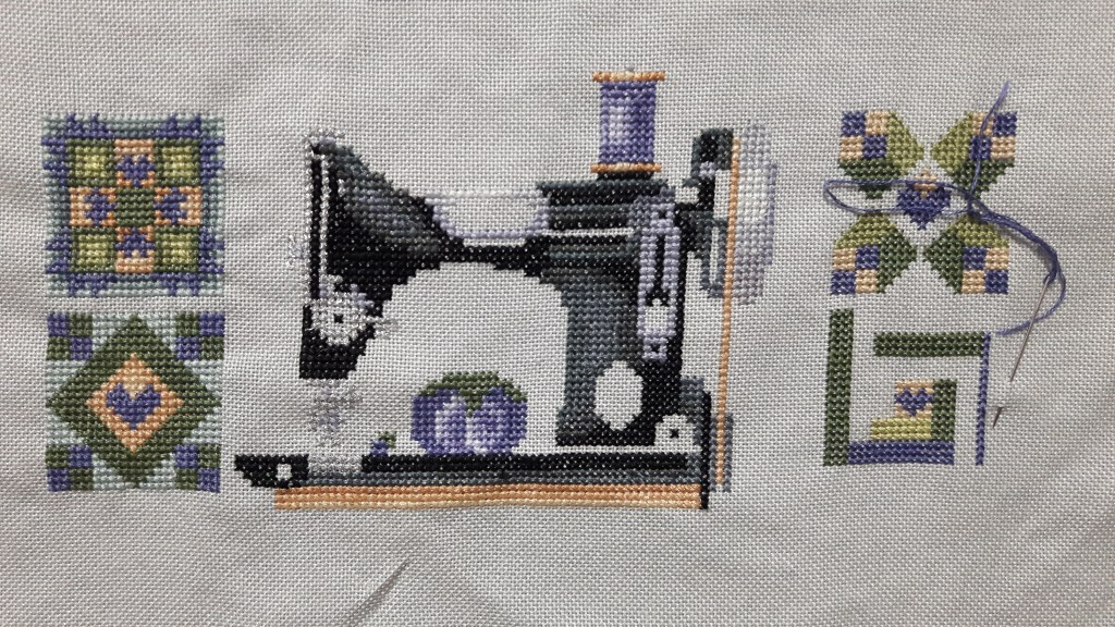 It’s a design from Stoney Creek, in some ways it’s a little bit dated in that the back-stitch (which I’ve still to start!) goes round the squares of cross-stitch, rather than cutting across to get a smoother outline, but it appealed to me as it includes a vintage sewing machine, quilting and sewing…perfect for me!