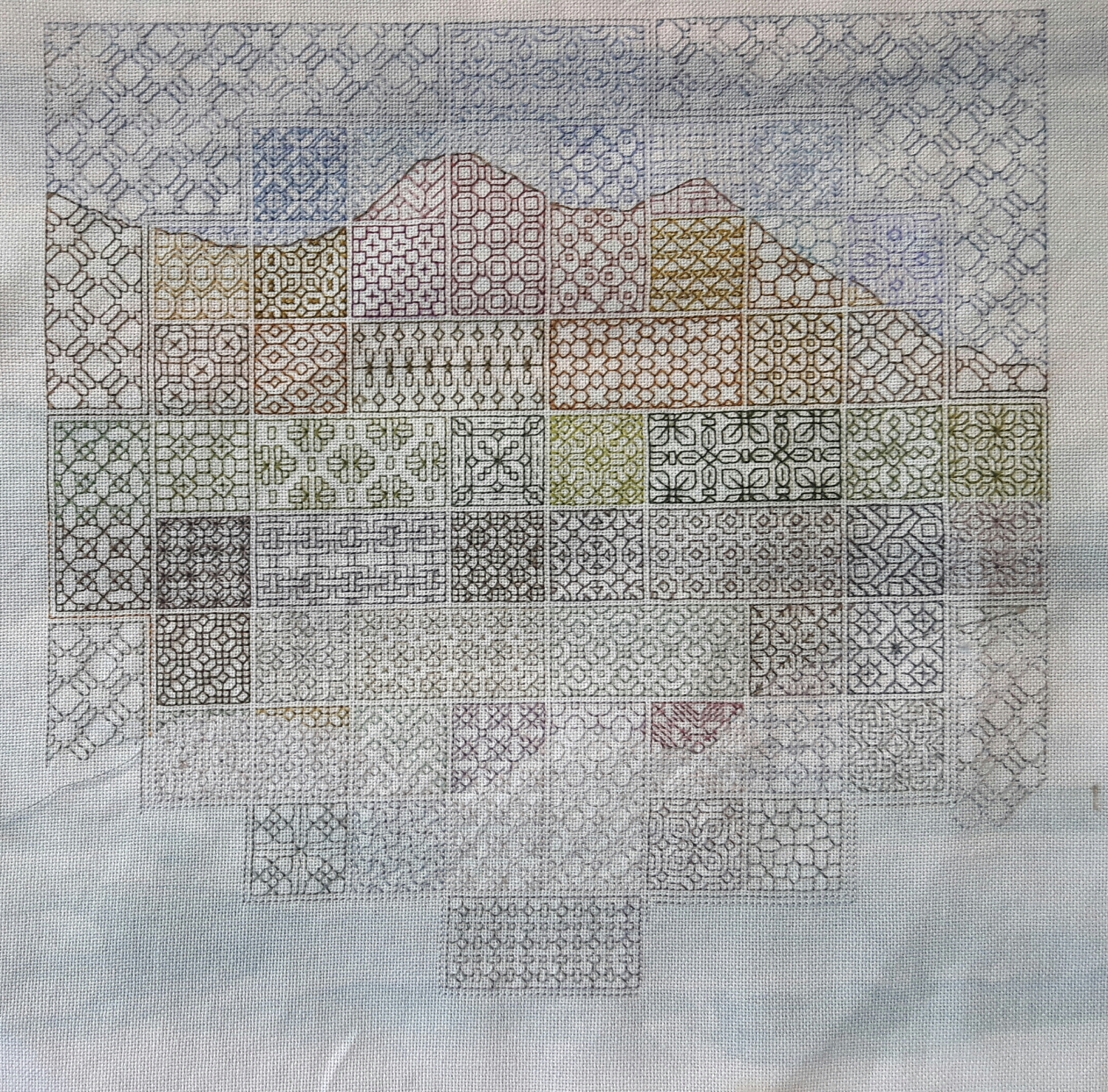 You can just see on the above photo that I had also started outlining the reflection of Catbells. I was using the floss that I used for the two side bits but I wasn’t sure it was dark enough particularly on some of the busy squares. I decided to wait until I’d stitched a bit more of the filler stitch.