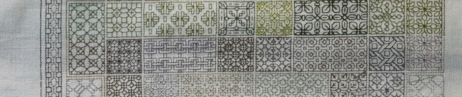 Well I’ve started my border, and now I’ve decided which border pattern to use it’s moving on fairly quickly. This blackwork pattern is last years free SAL from Peppermint Purple, Claire (the designer) did suggest a lovely colourway but I decided for my first try at blackwork I’d make it difficult for myself by making it into a picture of Catbells, my favourite place in the Lake District. Three weeks ago I’d just finished the main square…
