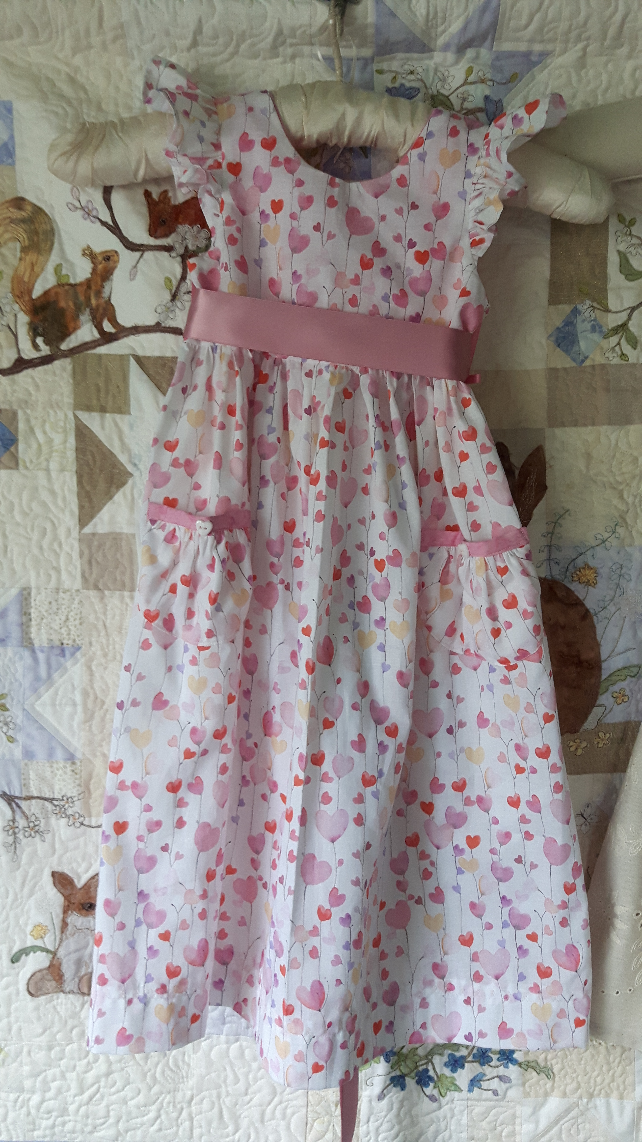 The youngest one is 6 and just requested something pretty and pink. I spotted the perfect fabric in B&M Fabrics in Leeds. It’s cotton with lots of hearts in varying shades of pink, very pretty.