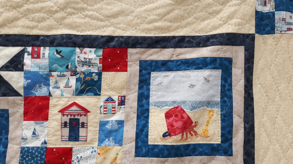 I’ve done two and a half sides so far, then I just need to do something in the corner blocks and maybe something in the dark blue narrow border, I’m thinking of maybe just stitching in the ditch just to give a border to the waves.