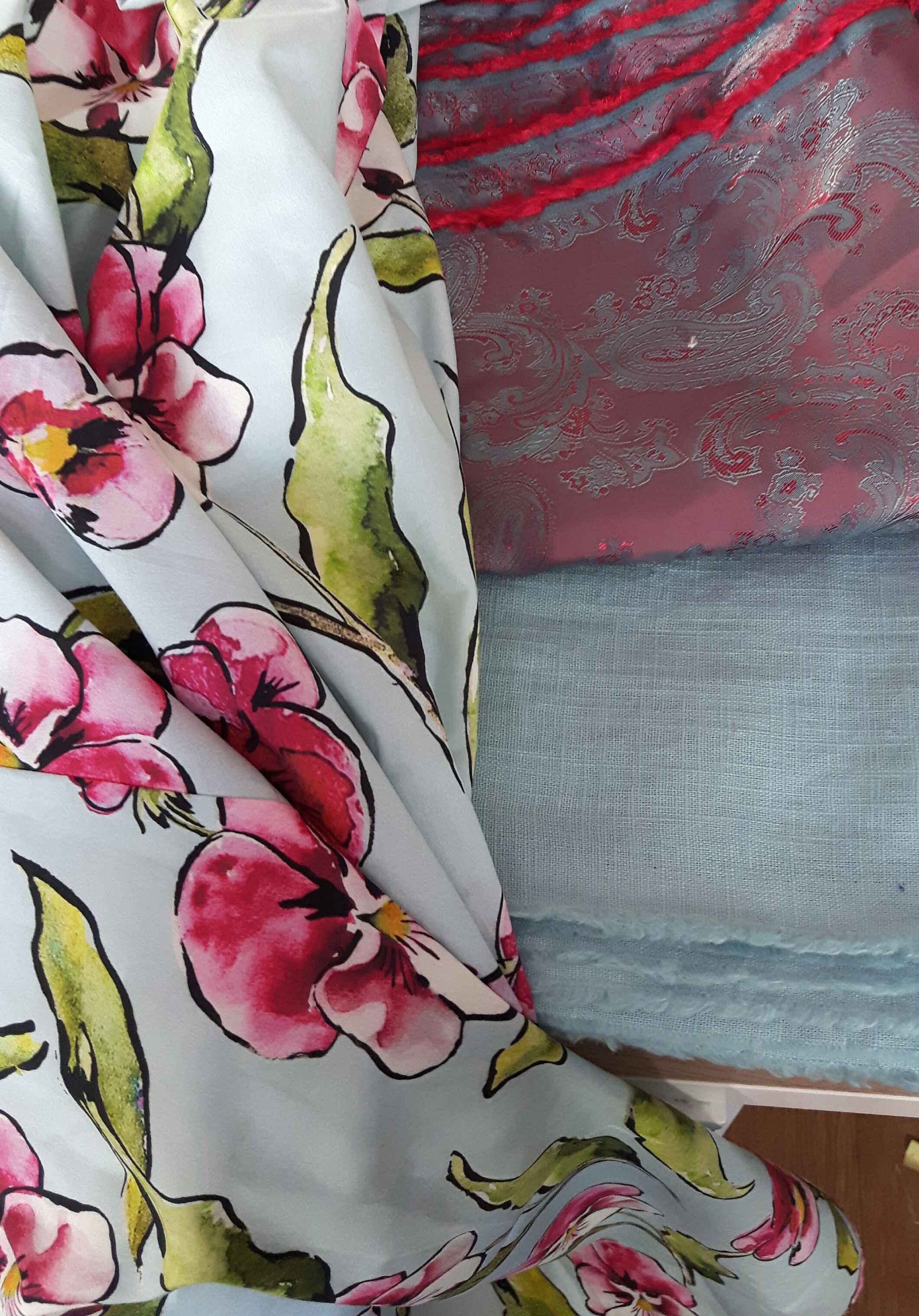 I looked on line for some linen, I was originally thinking a raspberry pink would be nice, but I spotted on the Fabrics for All website some lovely linen in both raspberry pink and a duck egg blue. I decided a trip to the shop was required. Fabrics for All is in Armley just outside the centre of Leeds, they have some gorgeous fabrics so it is definitely worth the two-bus trip to get there. The linen felt lovely and as soon as I tried the dress fabric against them, the duck egg blue won hands down. I also felt I was more likely too wear a duck egg blue coat again, it’s not so in your face as pink! I then called into Samuel Taylors in the centre of Leeds as I knew they had some jacquard lining fabrics. They had a perfect match, duck egg blue shot with raspberry pink! It was all meant to be…
