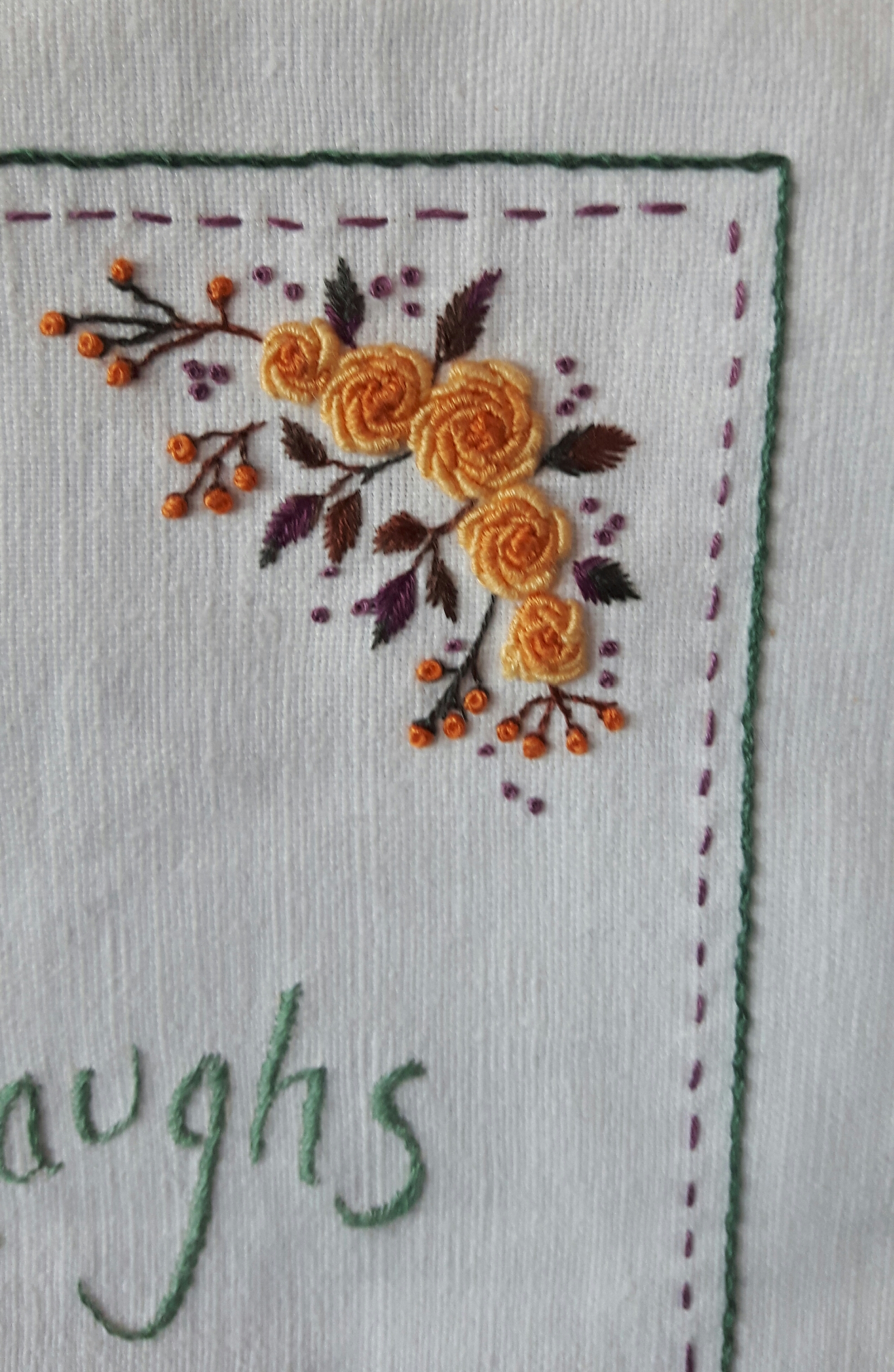 With the words stitched I started embroidering the flowers. I decided on orange roses and purple filler flowers, just like I have in my Amber & Amethyst garden. I used three shades of orange thread to make the bullion knots of the roses. I decided roses are a bit like buttonholes, there’s always one that’s a bit iffy! The leaves are stitched with fishtail stitch which is now my favourite for leaves. The buds are stitched with French knots and fly stitch.