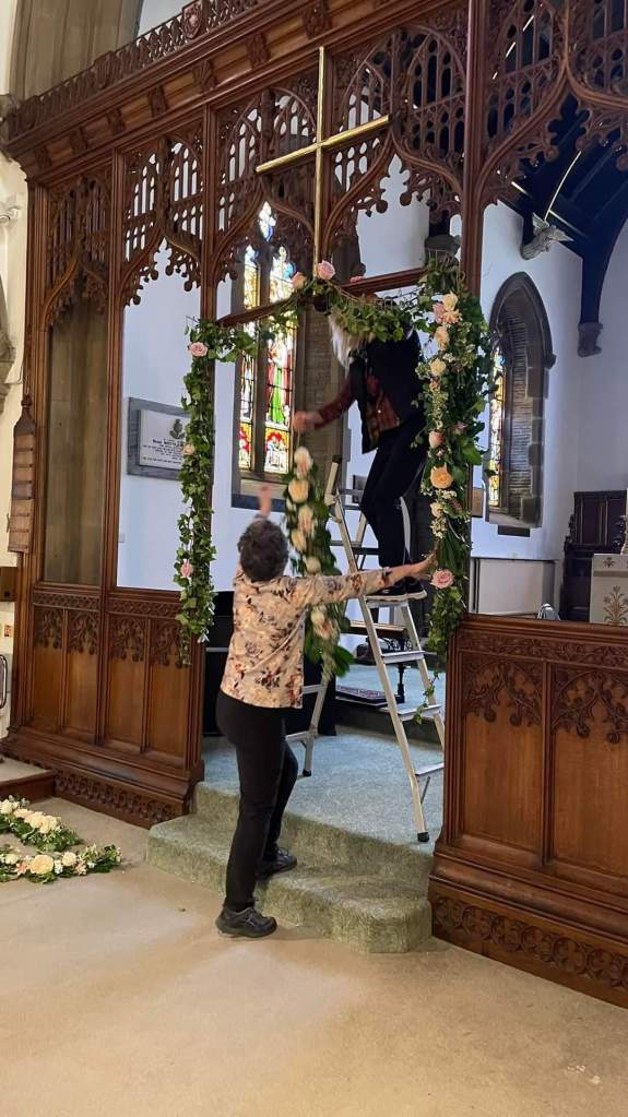 Here’s a photo of me and another helper starting to put the garlands up, the ivy and the odd roses on the left were the ones from the wedding before.