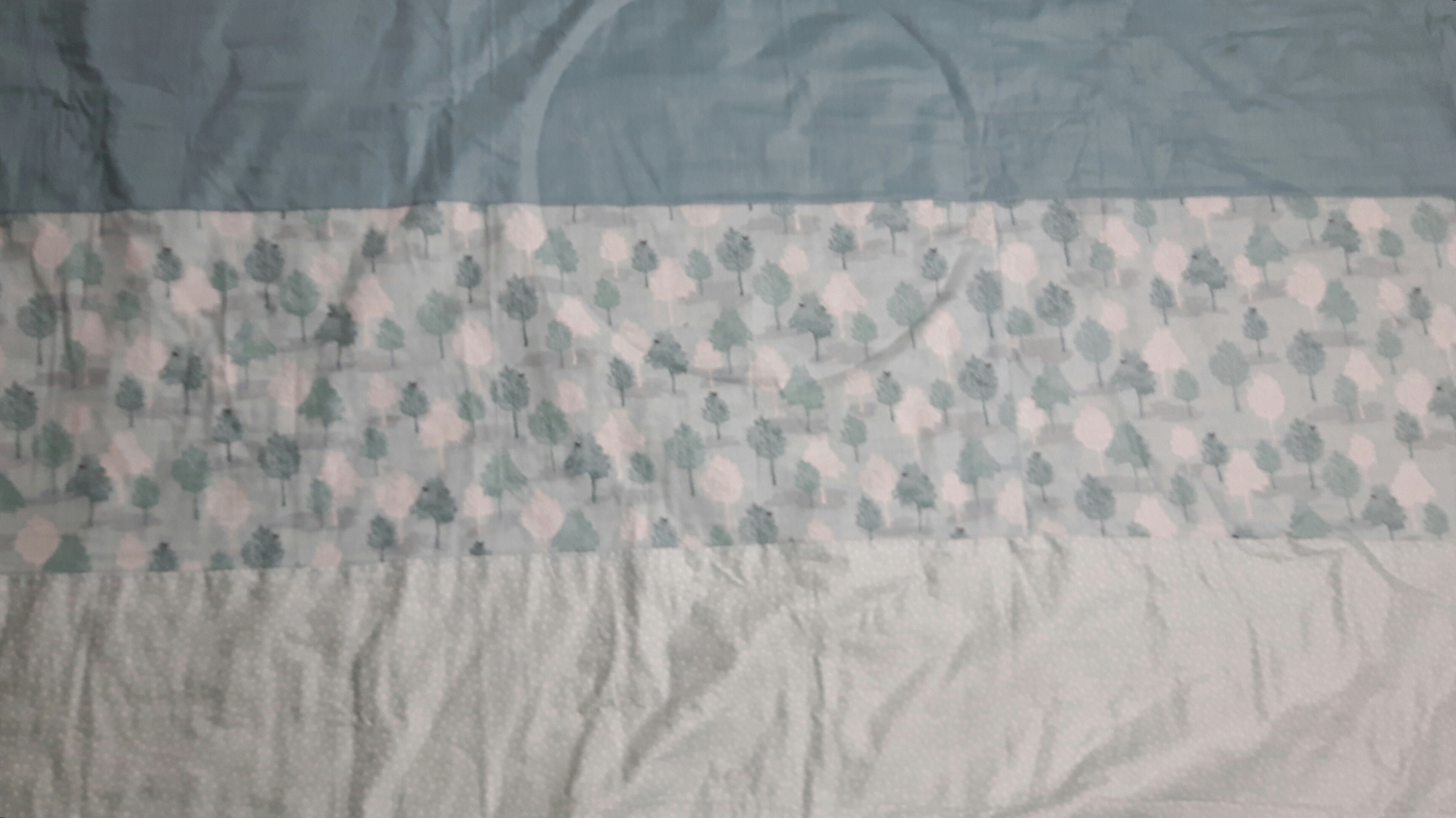I had three different fabrics for the back, a muted green, one with trees on and a spotty one that glows in the dark like little stars. I worked out a piecing plan so I had three strips, a narrower one of trees for the middle and I originally planned the plain one at the bottom and the spotty one at the top. Unfortunately I sewed the plain one to the top and really couldn’t be bothered to unpick the whole seam. so it’s now a big green hill with trees in the middle and a field of cotton grass below!!!