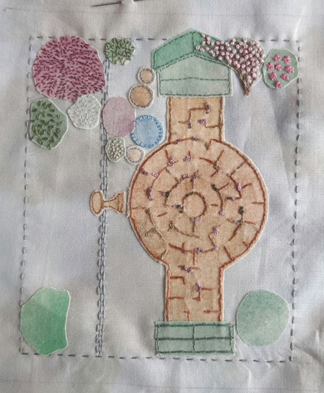 I’ve finally made a bit more progress on my garden stitching, not a huge amount as I’m still a bit hesitant on how I’m going to get the effect I want. Three weeks ago on my last SAL post I’d started embroidering the applique bushes…