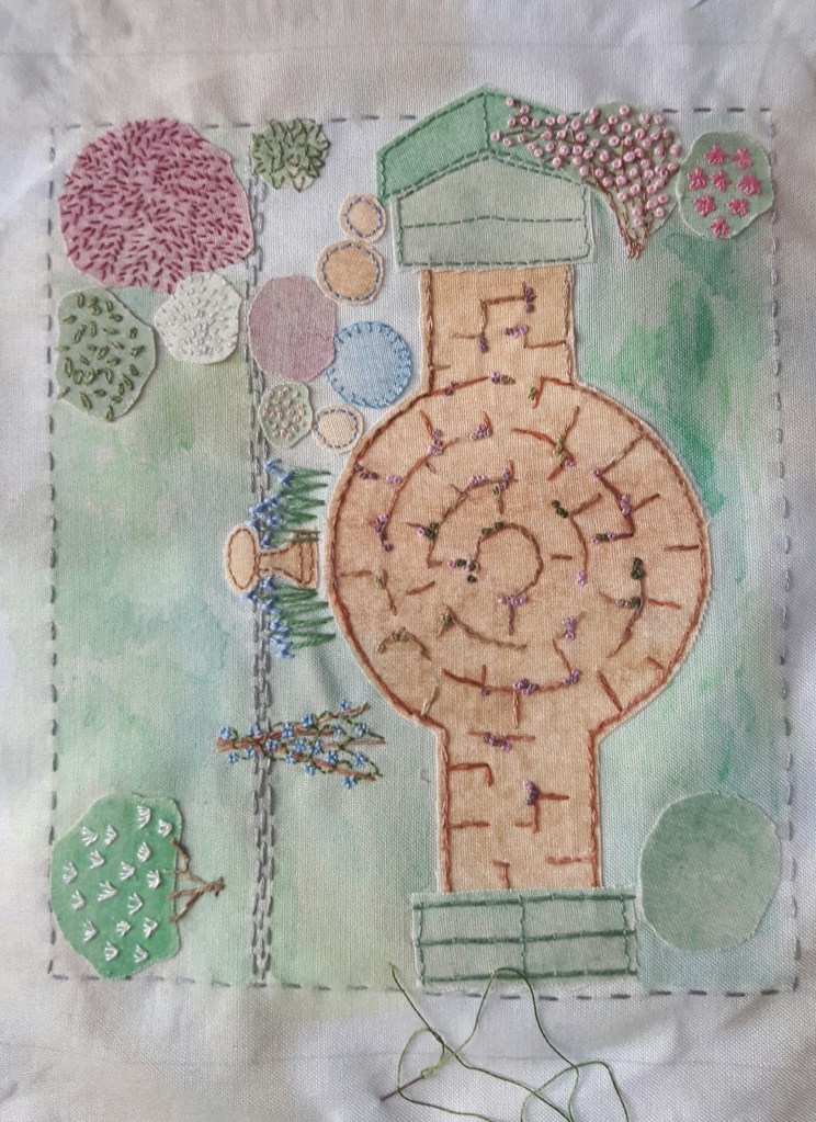 The perspective of the piece was still making me procrastinate even more, having designed the piece as if above the arch, if I stuck true to the view then things like the bird bath would be just circles, which way do I embroider plants such as irises…