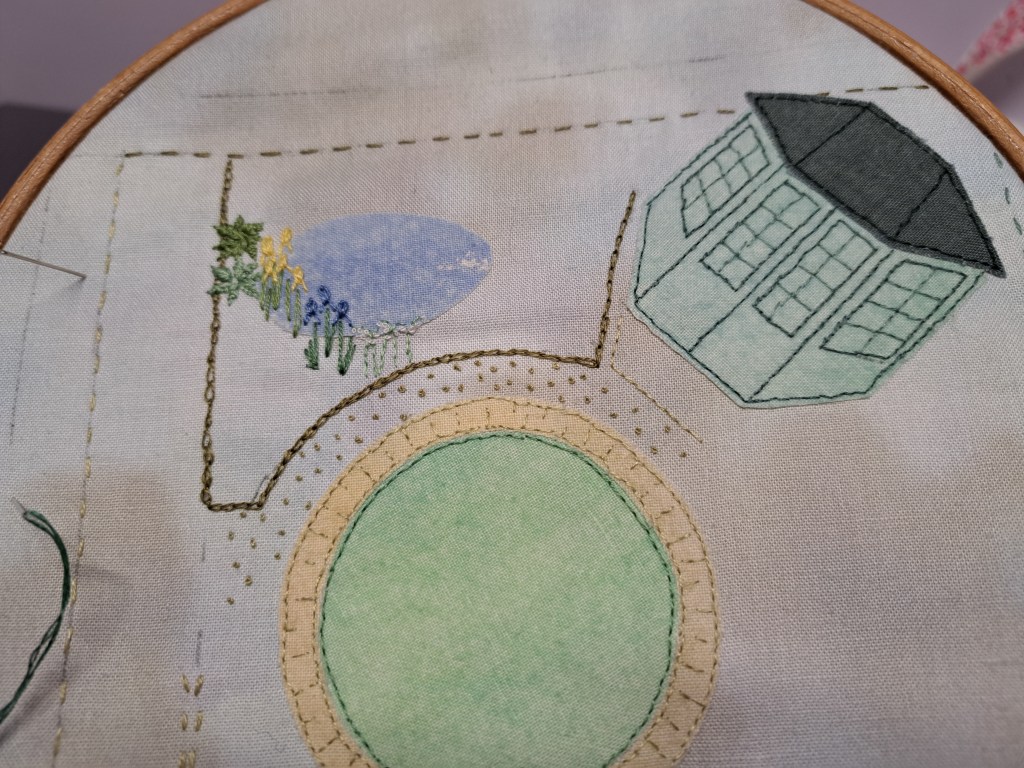 I’ve been busy trying to catch up with Christmas preparations over the last couple of weeks leaving me with little time to stitch my garden. Three weeks ago I’d made a start on my second big piece for my fabric book, this embroidery depicts the lawn and the summerhouse area….