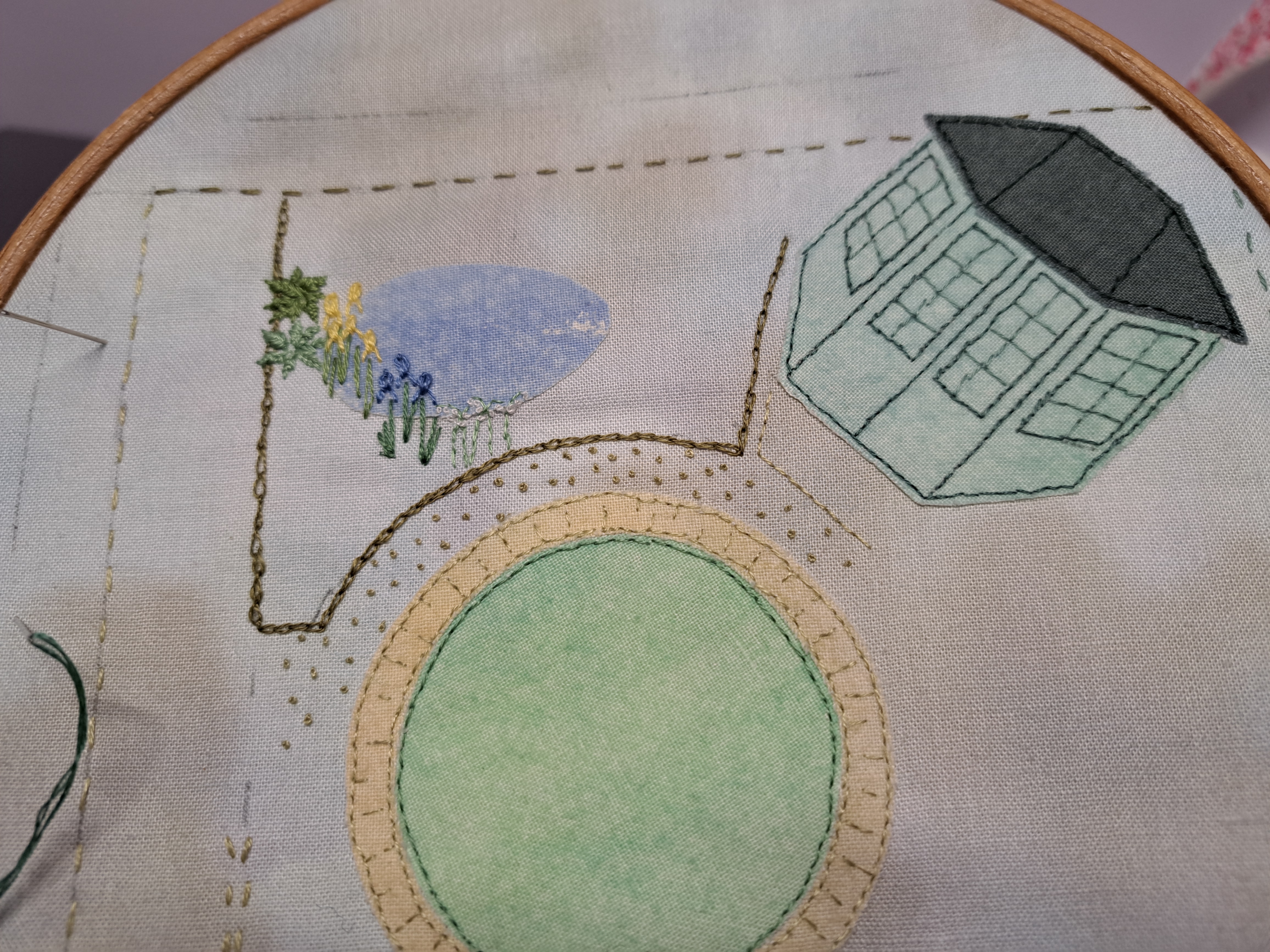 I’ve begun to embroider the plants round the pond, so there’s a couple of hostas, some irises and some solomon’s seal…