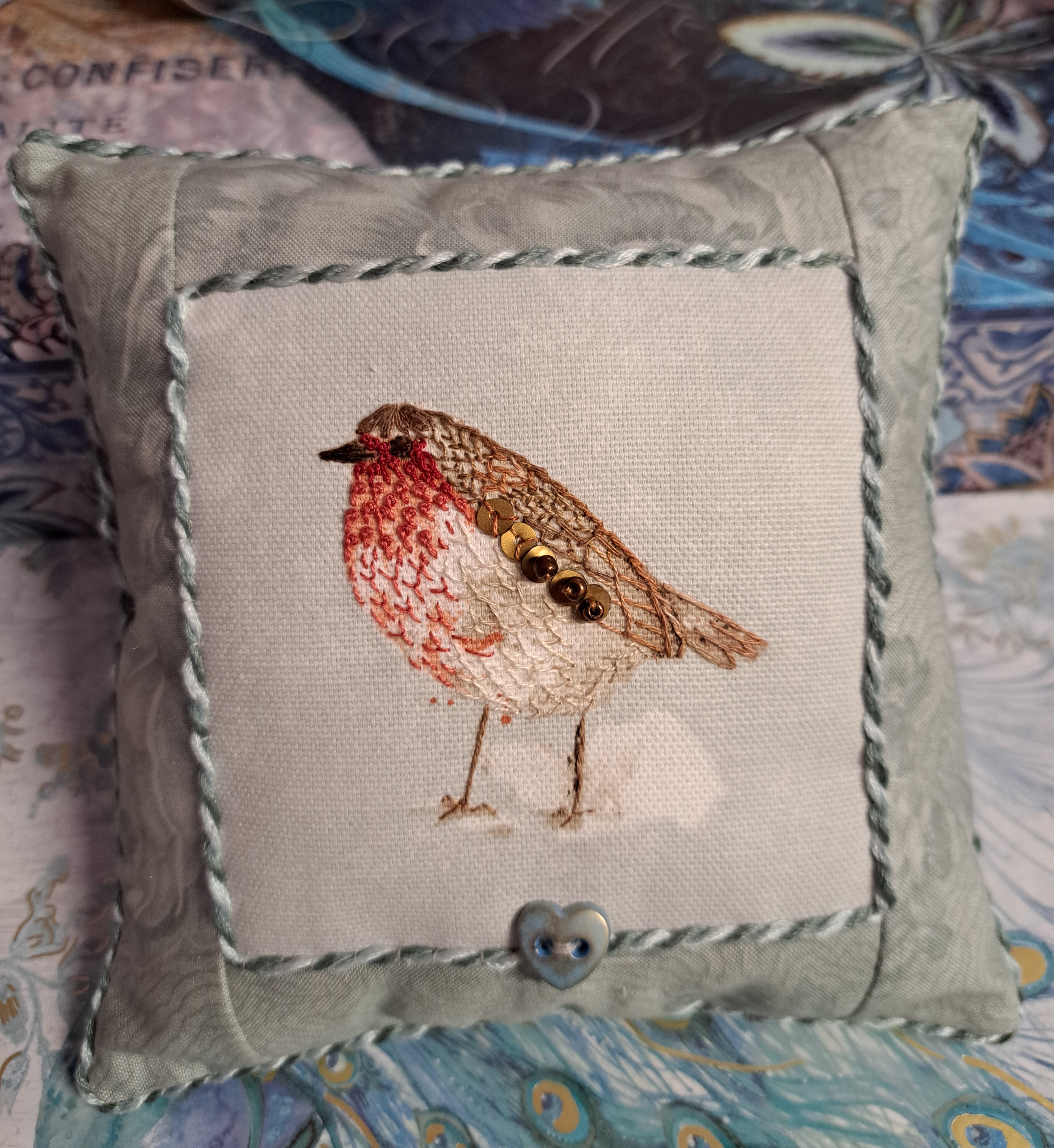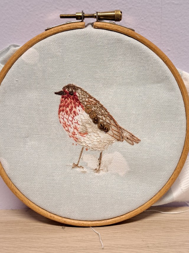 Last month I embroidered a robin, it was pretty easy to do as I used a heavier weight of cotton which has a very pretty design of robins. I used one as the base for the embroidery…