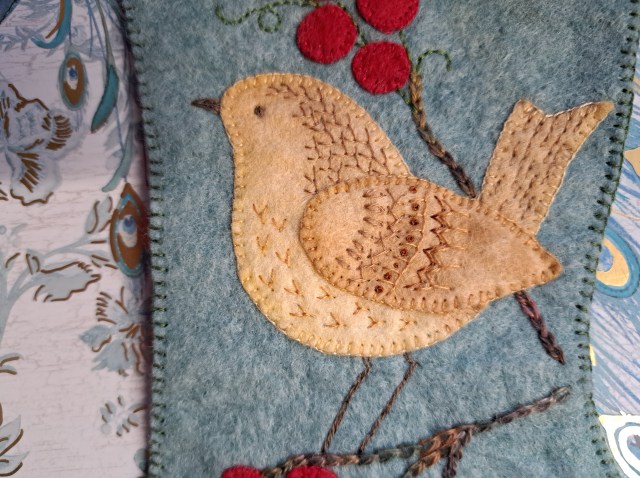 The second one I chose is a design of a wren with some holly. It’s a design from 2019, still available on Michelle’s blog. As with the barn owl I painted the plain felt in my stash with silk paints, it’s given a nice subtle shading to the head and the wing. I added some embroidery to the bird too with fly, feather, chain and blanket stitch together with a few French knots.