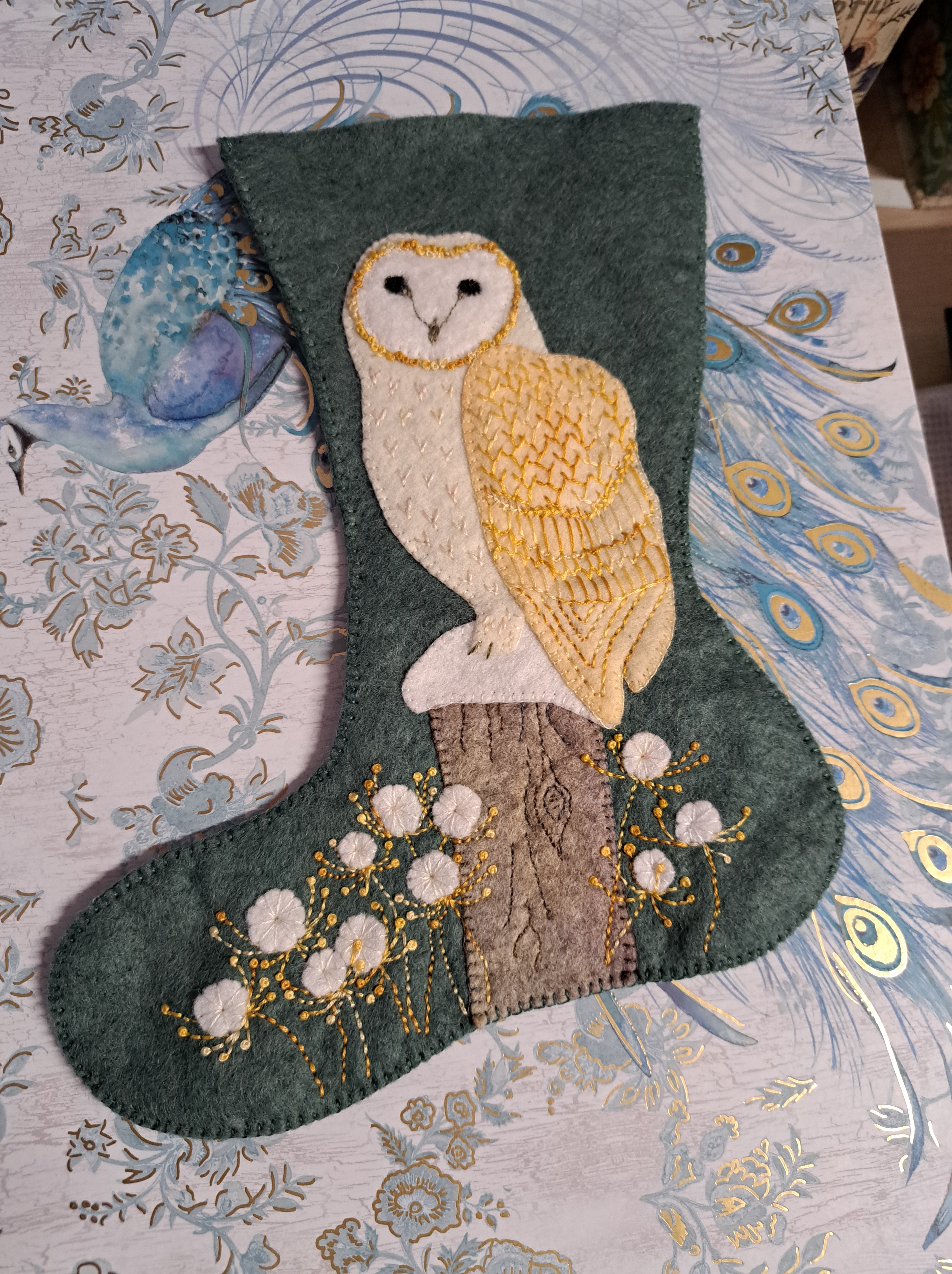 The second one I chose is a design of a wren with some holly. It’s a design from 2019, still available on Michelle’s blog. As with the barn owl I painted the plain felt in my stash with silk paints, it’s given a nice subtle shading to the head and the wing. I added some embroidery to the bird too with fly, feather, chain and blanket stitch together with a few French knots.
