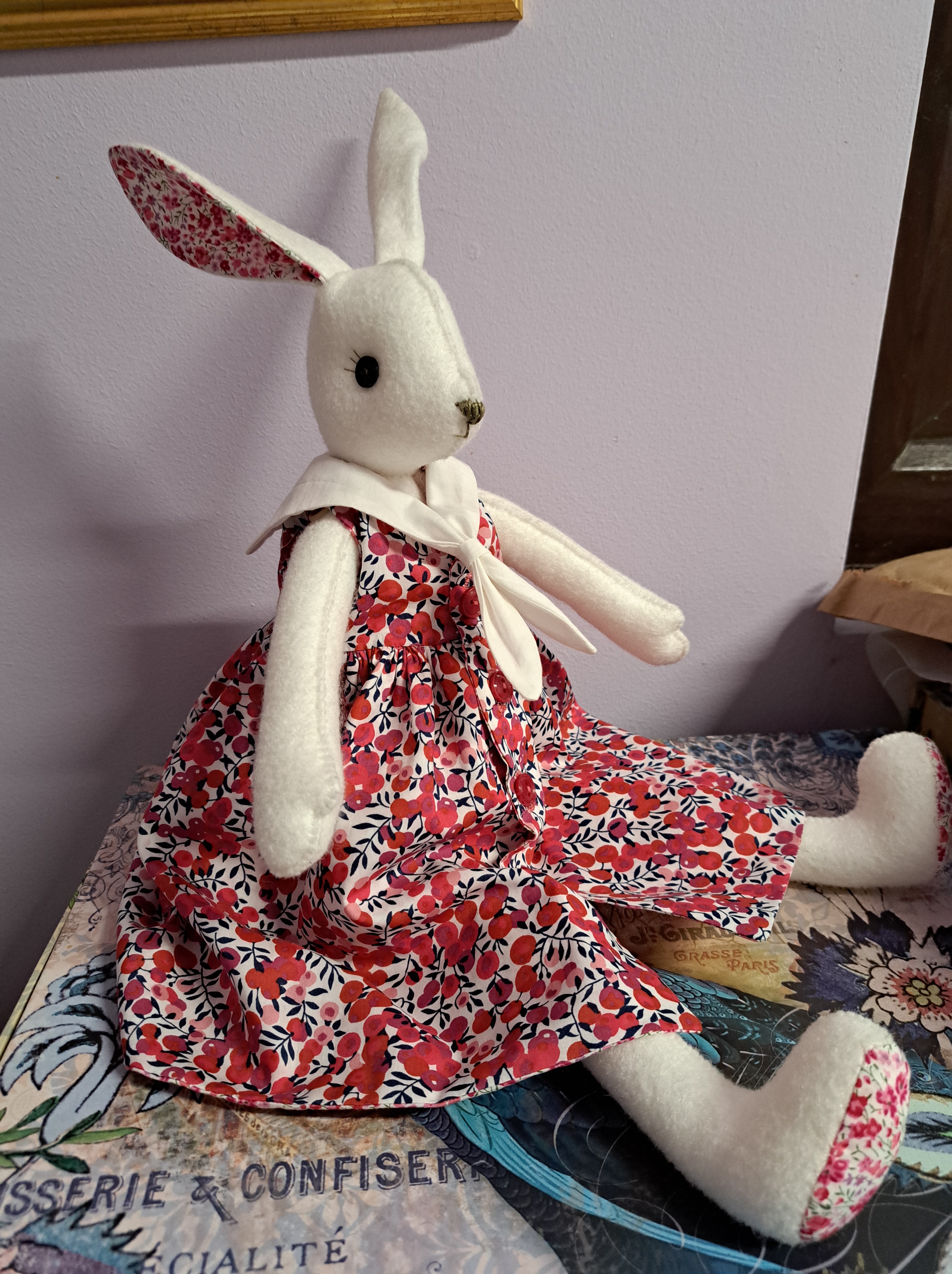 My daughter Helen asked me to make her a Luna Lapin for Christmas, she wanted a Liberty print so she sent me two quarter yards of pretty Liberty tana lawn. I used one with a pretty ditsy pink flower design for the ears and feet…