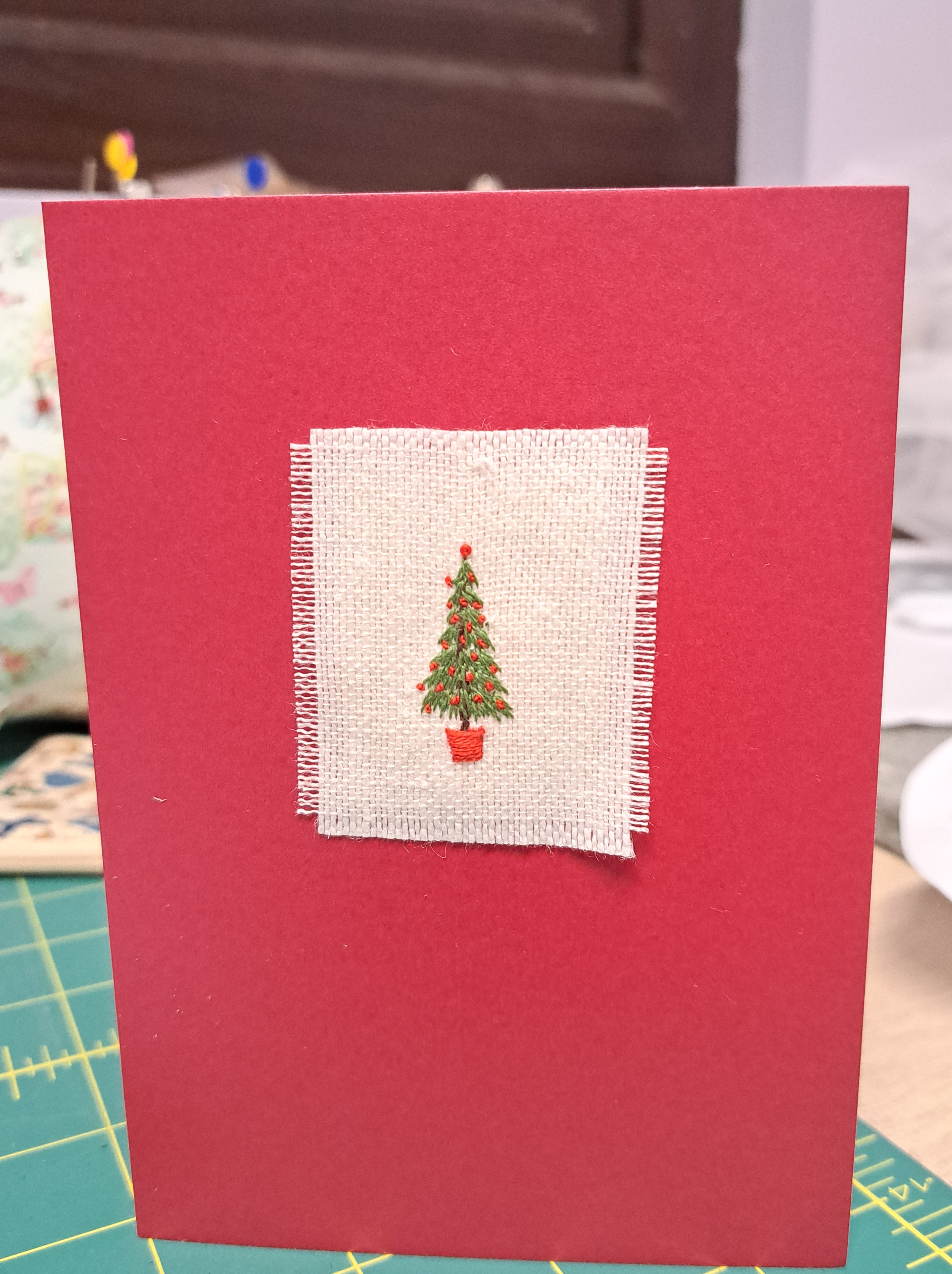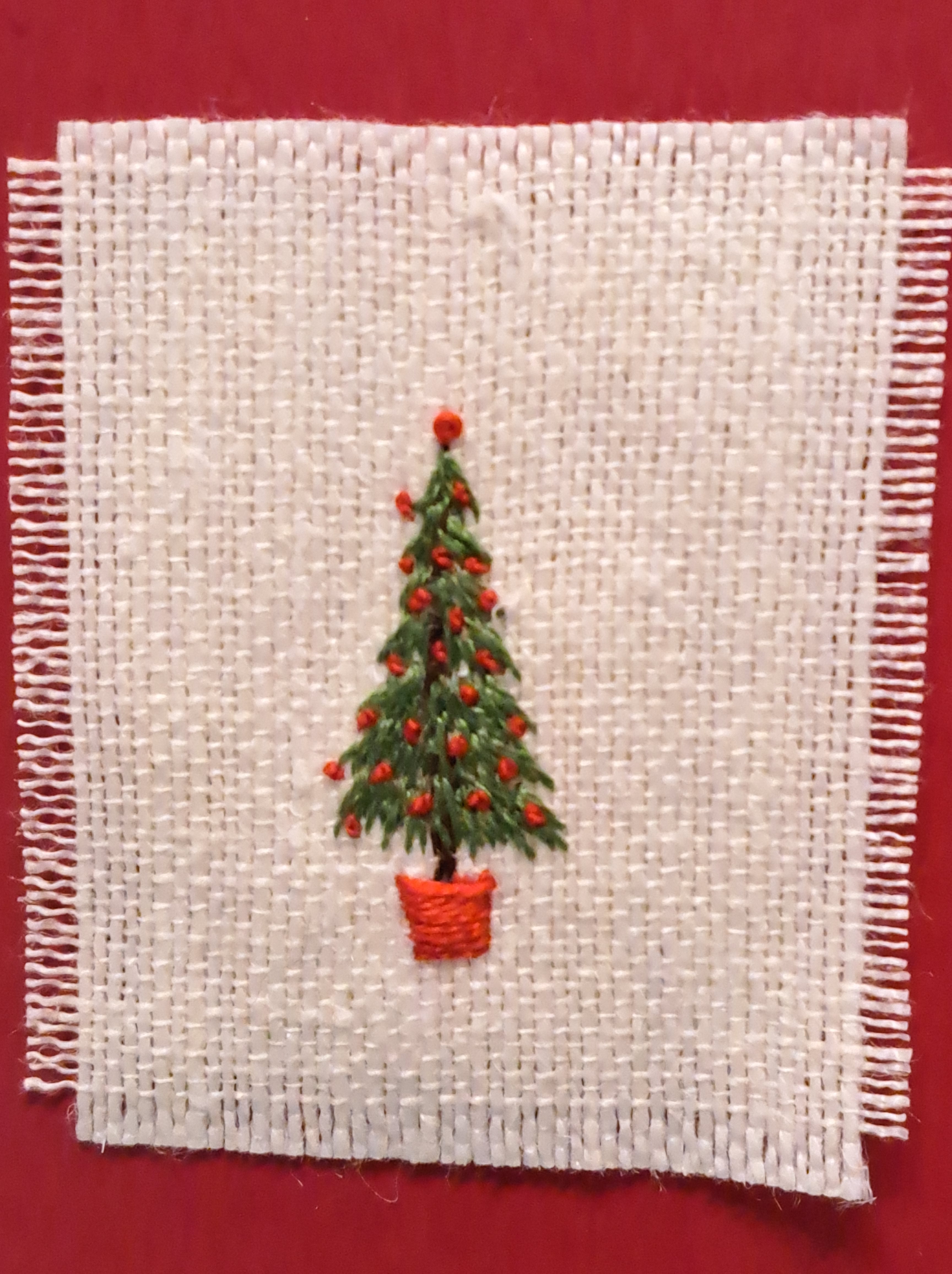 I just used straight stitch for the branches, stem stitch for the trunk and some satin stitch for the pot. A few red French knots just nicely finished it.