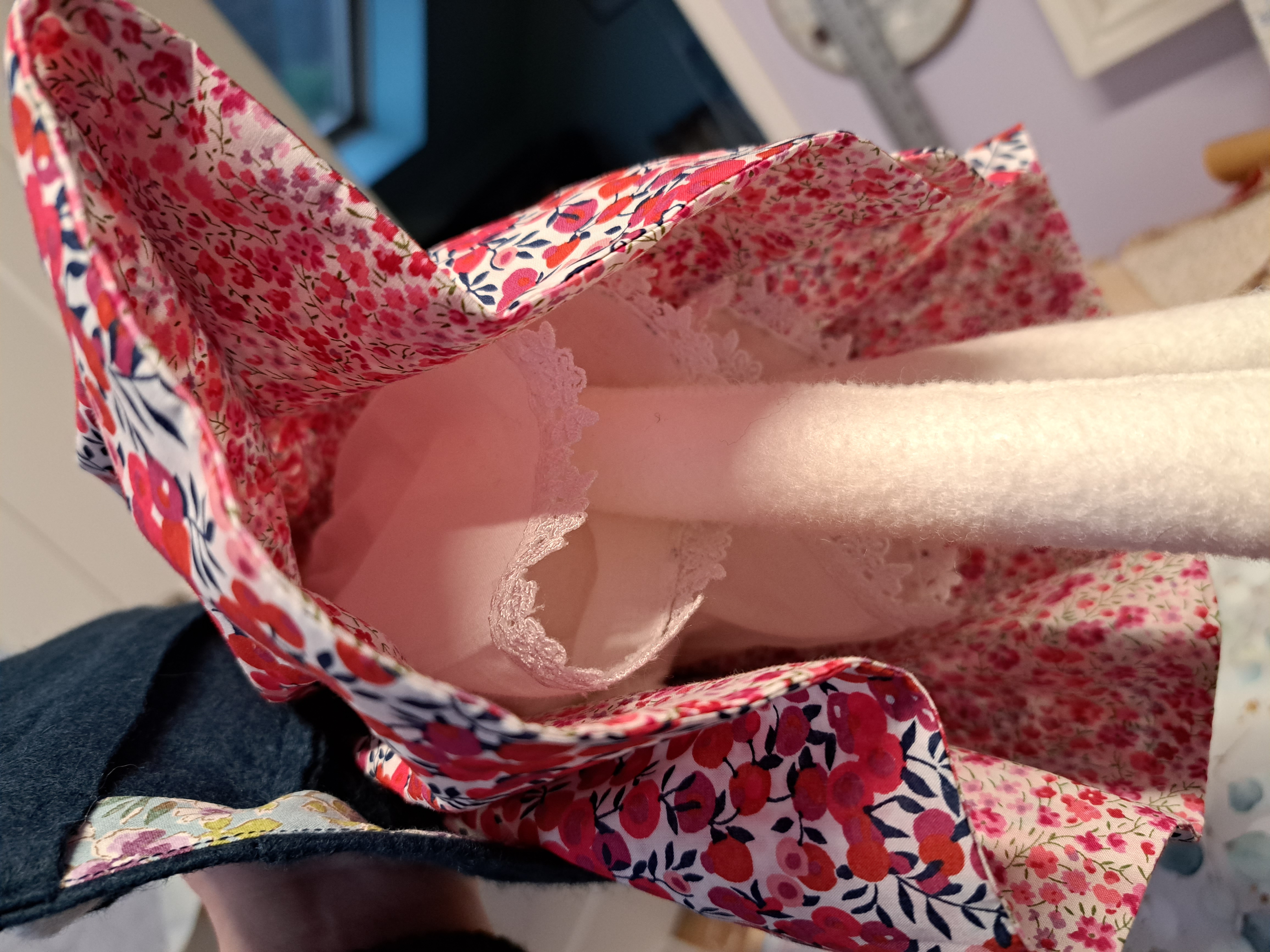 The well dressed rabbit I made for my daughter for Christmas has gone to her new home. She was made from the patterns in the Luna Lapin books by Sarah Peel of Cool Crafting in Kendal. She has a reversible sailor dress made from Liberty tana lawn and a dark blue wool coat, looking suitably respectable…so long as the wind didn’t blow her skirt up as I didn’t have chance to make her any undies during the busy run up to Christmas! The phrase ‘fur coat and no knickers’ comes to mind…